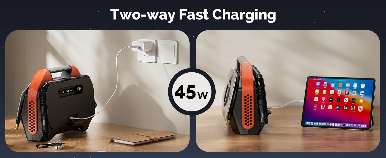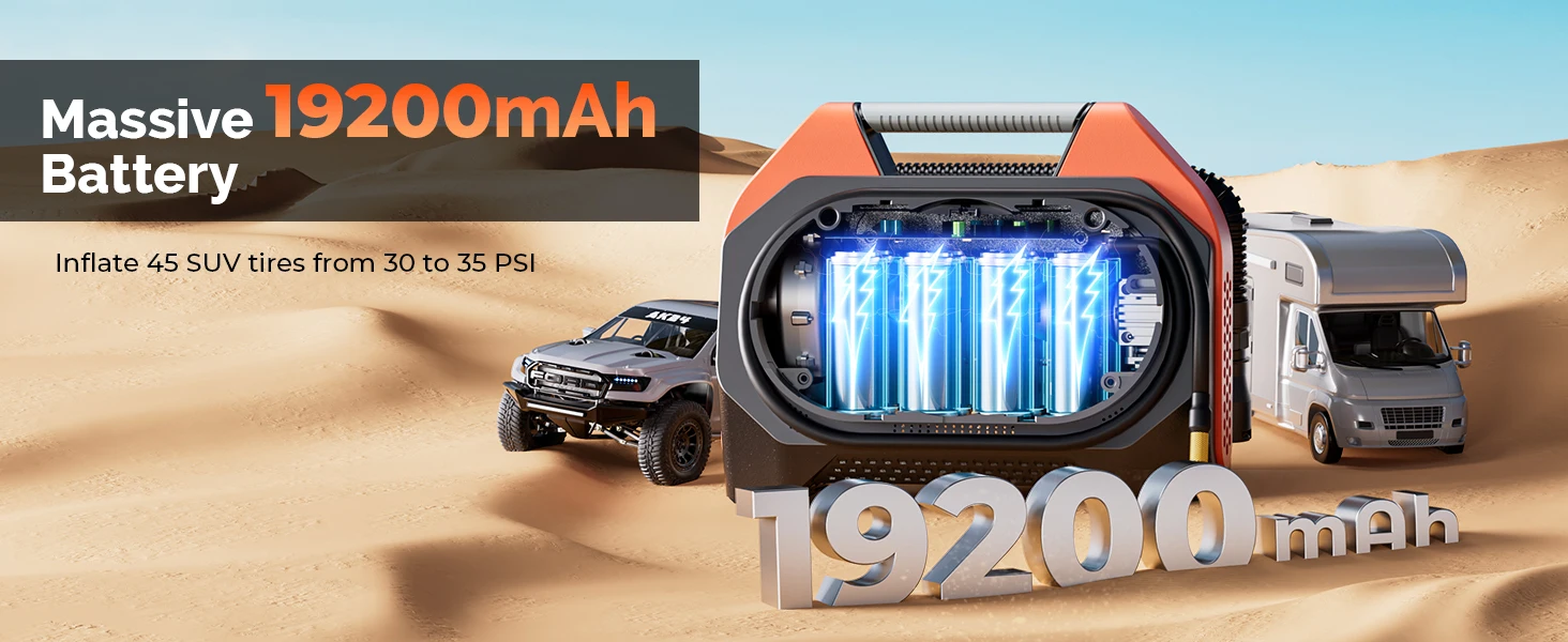 2.1920mAh 리튬 배터리, 42L/M @ 0PSI(1.5CFM@0PIS) 최대 압력 160PSI(11bar)의 고속 인플레이션.