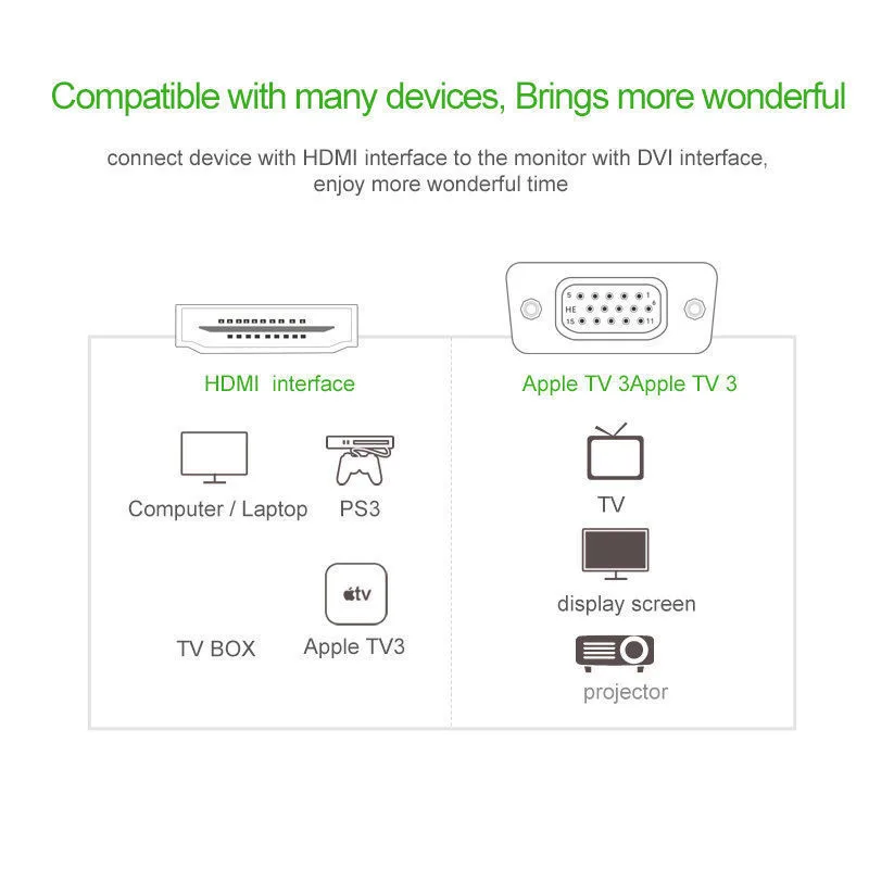 이 케이블 어댑터는 컴퓨터, 노트북, HD 셋톱 박스, 하드디스크 플레이어, ps3 플스호환용 플스호환용 플스호환용, PS4, Xbox360 및 태블릿과 같은 HDMI 인터페이스가 있는 장치의 HDMI 신호를 VGA 신호로 전송하고 이를 대형 화면 장치에 표시하도록 설계되었습니다. 모니터, LCD TV, 프로젝터 등.