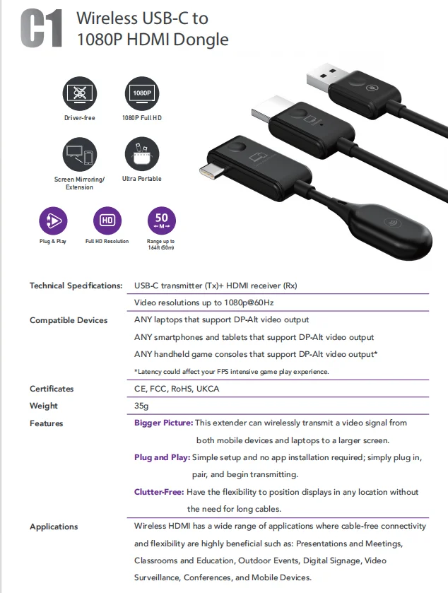 | Function | 50m Wireless USB C Transmitter |