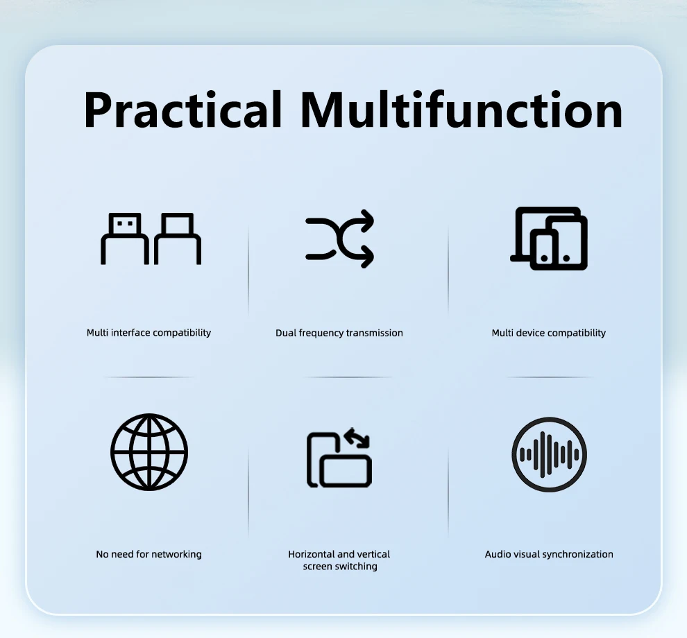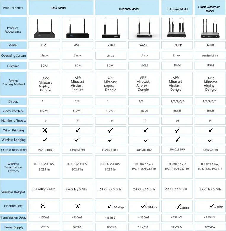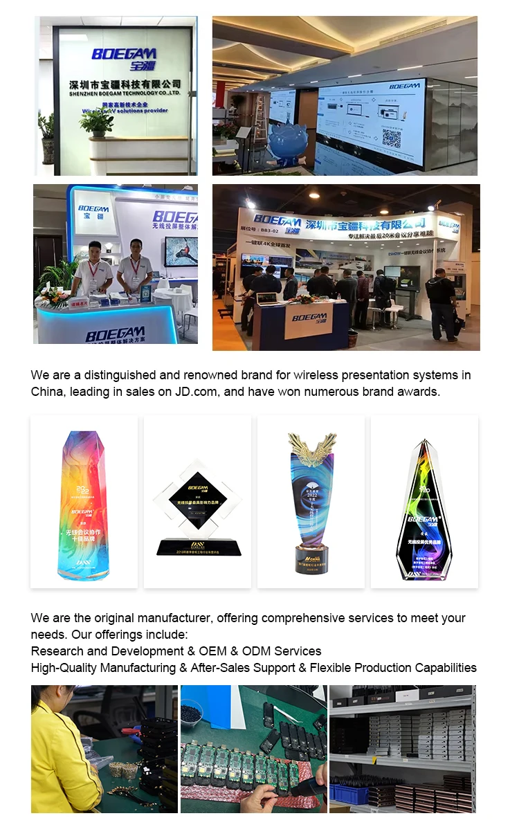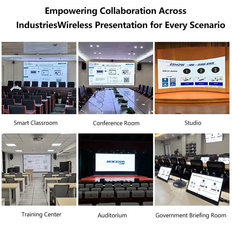A6: 당사의 무선 프리젠테이션 시스템은 다음과 같은 분야에서 널리 사용됩니다. 원활한 회의를 위한 기업 사무실 및 회의실 대화형 학습을 위한 교육 교실 및 교육 센터 안전한 프리젠테이션을 위한 의료 및 정부 기관 빠른 전문 시연을 위한 전시회 및 이벤트