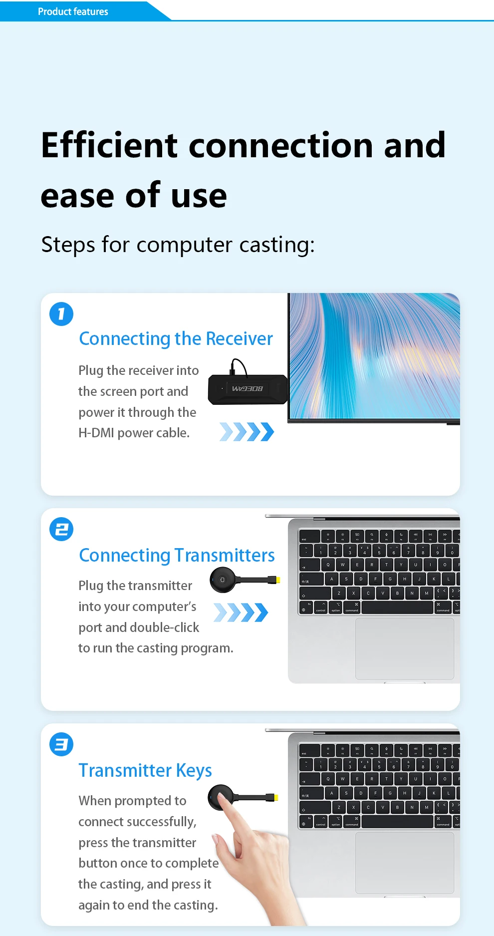 A1: 우리 시스템은 플러그 앤 플레이 방식으로 설계되었습니다.송신기와 수신기를 연결하고 간단한 화면 가이드를 따라하면 몇 초 안에 화면 공유를 시작할 수 있습니다.기술적 배경이 필요하지 않습니다.따라서 사무실 회의, 교실, 교육 센터 및 하이브리드 협업 환경에 적합합니다.
