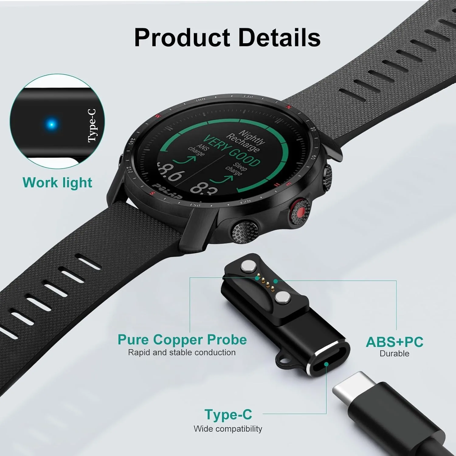 USBC 고속 충전: USBC 포트(노트북/어댑터)를 통해 5V/1A의 안정적인 출력을 지원합니다.내장된 과전류/전압 보호 기능으로 Polar 배터리 상태를 보호합니다.