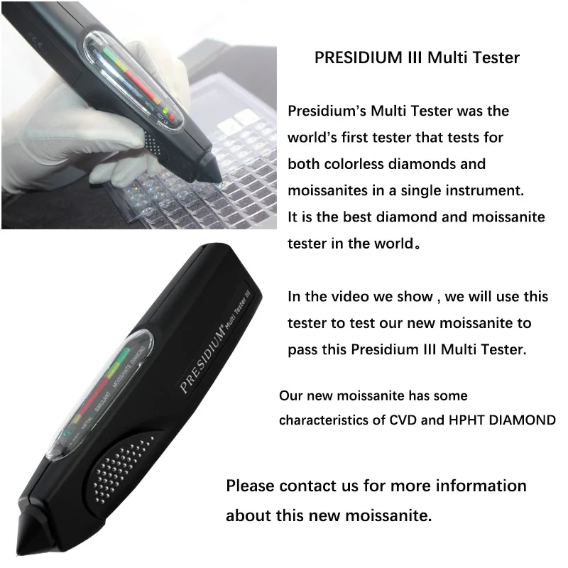 Presidium Multi Tester III를 통과할 수 있는 유형의 특수 Moissanite 원석입니다. 다른 장비는 테스트 통과를 보장하지 않습니다. 따라서 색상, 투명도, 불꽃색, 굴절률 측면에서 천연 다이아몬드와 매우 유사합니다.