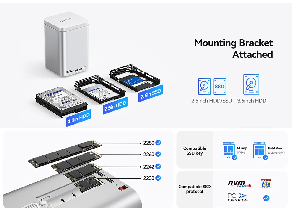2230/2242/2260/2280 크기의 듀얼 프로토콜 NVMe/SATA SSD와 호환됩니다.