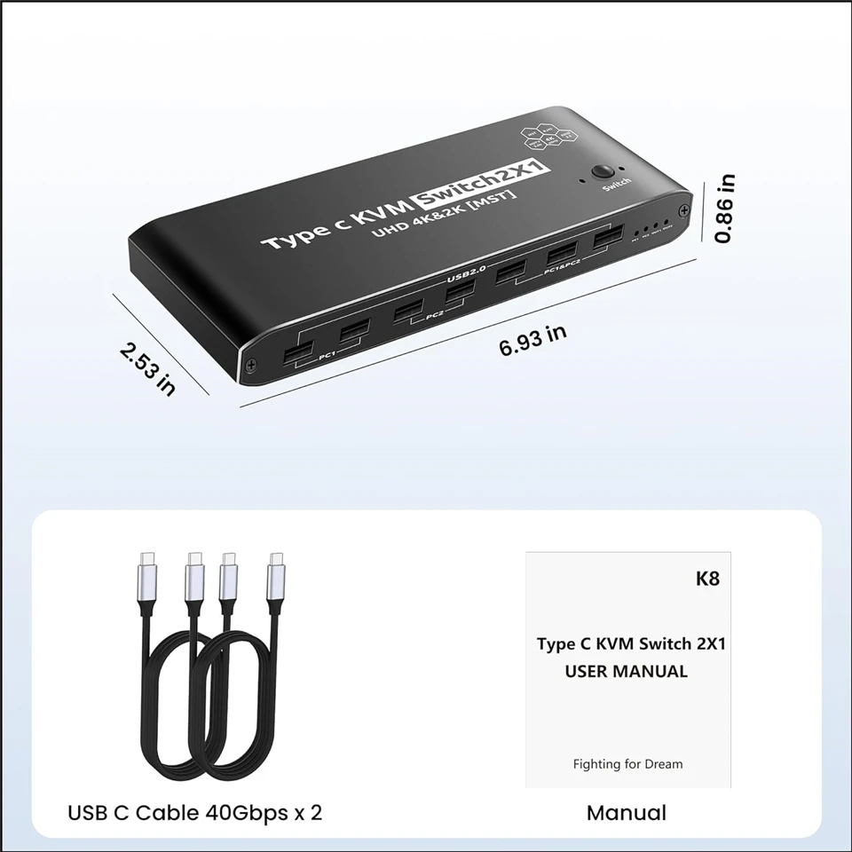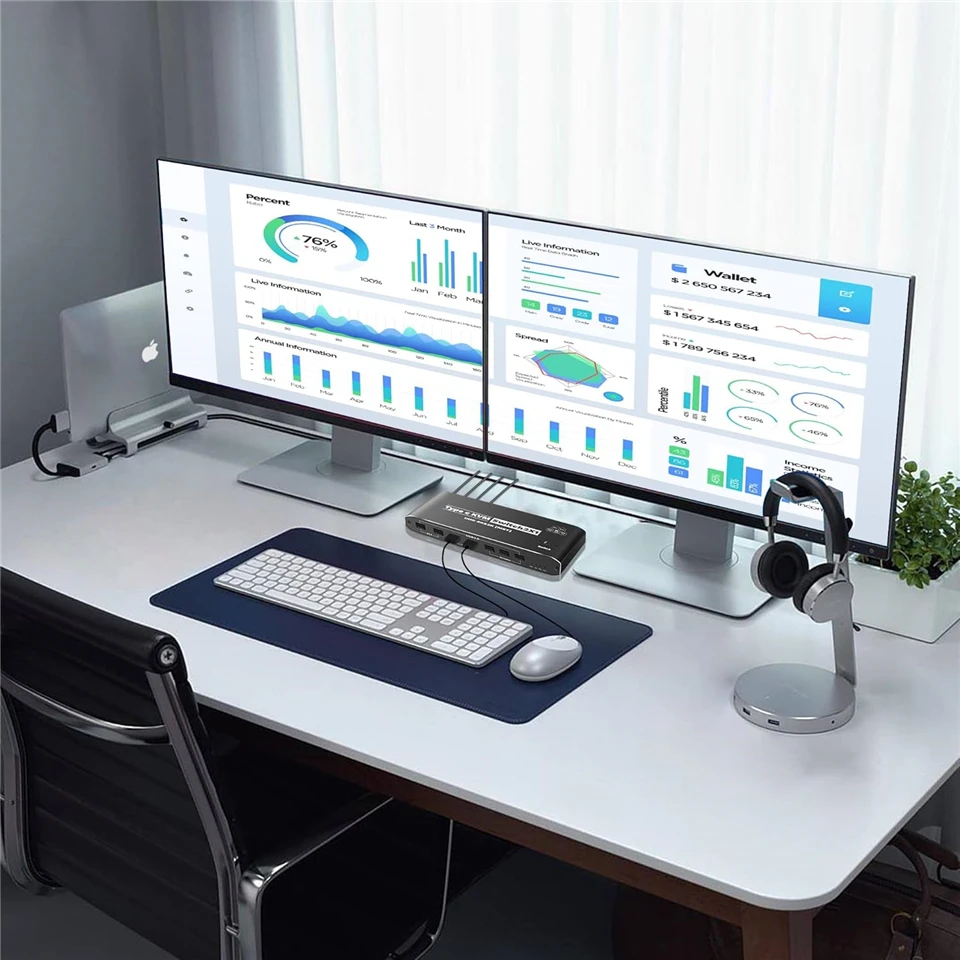 ?두 대의 컴퓨터 간 손쉬운 전환: 공간 절약형 USB C KVM 스위치 2대의 컴퓨터는 두 대의 워크스테이션을 하나로 결합하여 공간을 절약합니다.듀얼 모니터, 키보드, 마우스, 프린터 등의 주변 장치를 공유하여 별도의 모니터와 주변 장치 세트가 필요하지 않습니다.