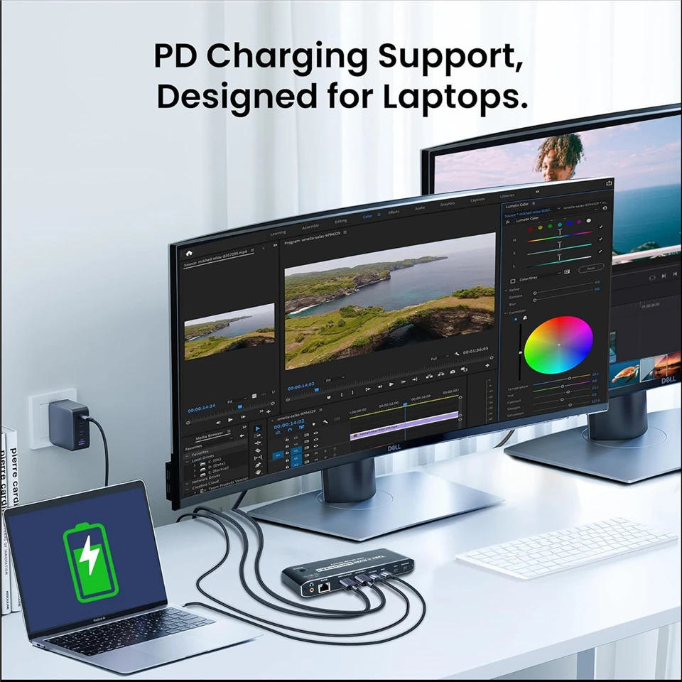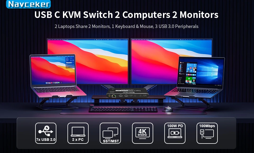Navceker Thunderbolt KVM 스위치 Max는 7개의 USB 장치를 지원하고 두 개의 모니터로 두 개의 노트북을 공유합니다.