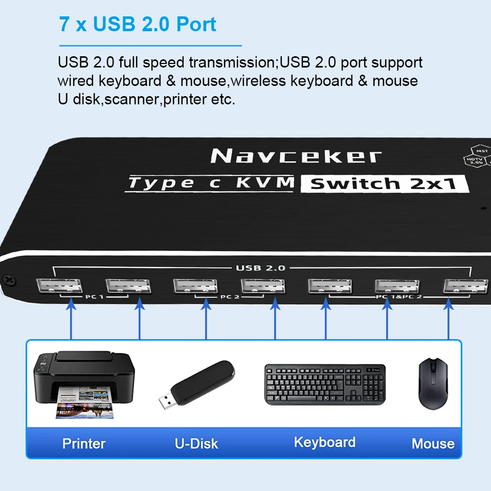 7개의 USB 2.0 포트가 있는 Navceker USBC KVM 스위치는 유선 또는 무선 키보드, 마우스, 프린터, 스캐너, USB 플래시 드라이브, 카메라 등을 인식합니다.