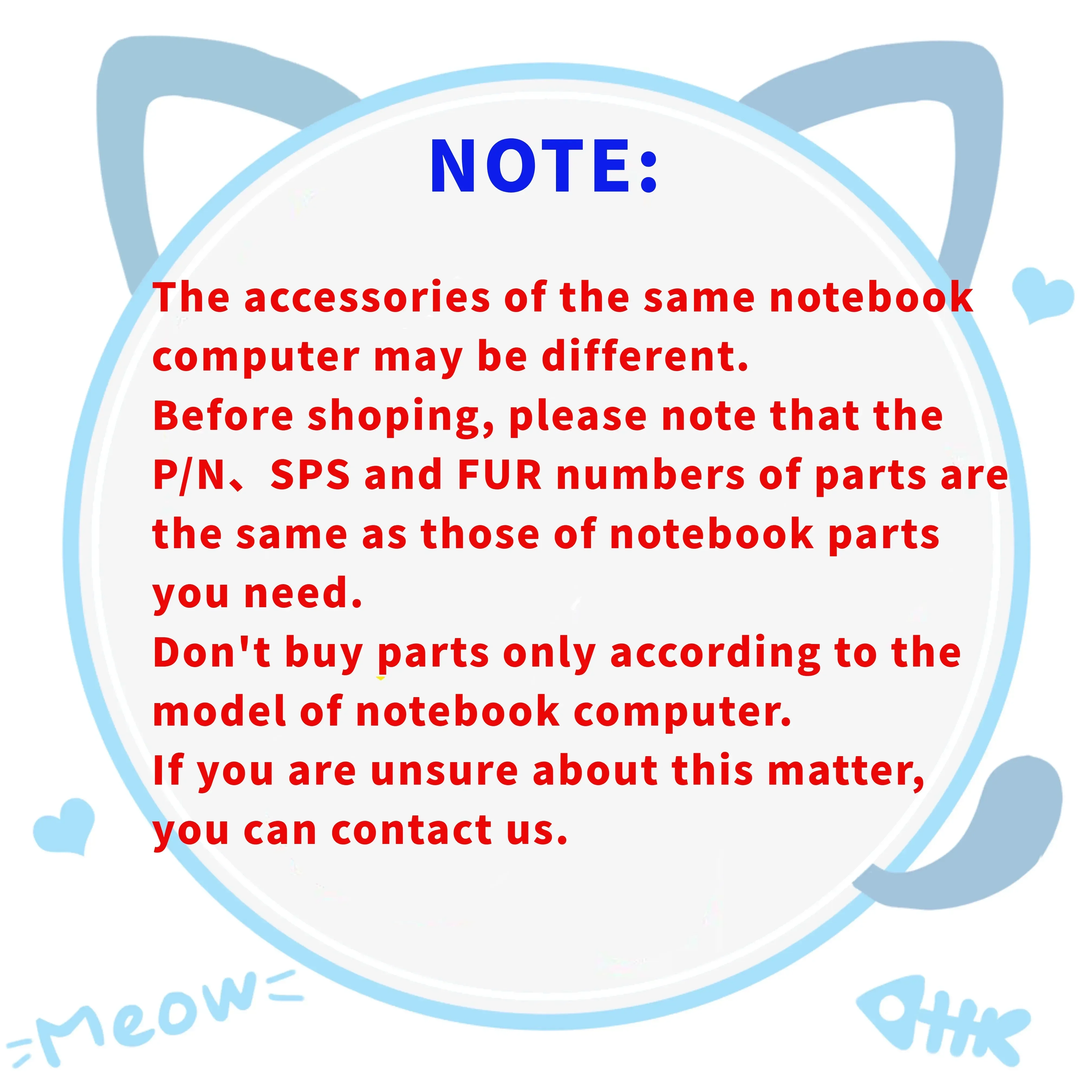 1.동일한 노트북 모델이라도 동일한 부품이라도 구성 요소가 다를 수 있으며 서로 호환되지 않을 수 있습니다.부품의 P/N, SPS 및 FUR 번호는 필요한 번호와 동일합니다.노트북 모델만을 기준으로 부품을 구매하지 마십시오.이 문제에 대해 확실하지 않은 경우 당사에 문의하실 수 있습니다.