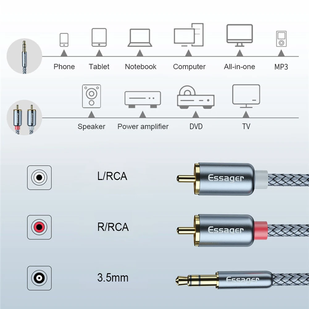 Essager RCA Aux 케이블 3.5mm 잭2 RCA 오디오 케이블 Y 커넥터 어댑터 분배기 전력 증폭기 스테레오 스피커 용