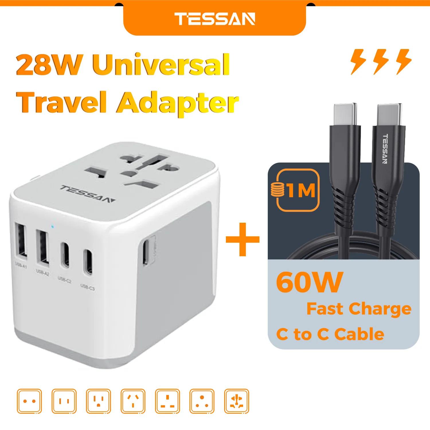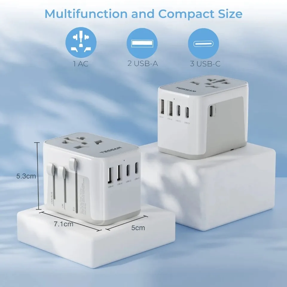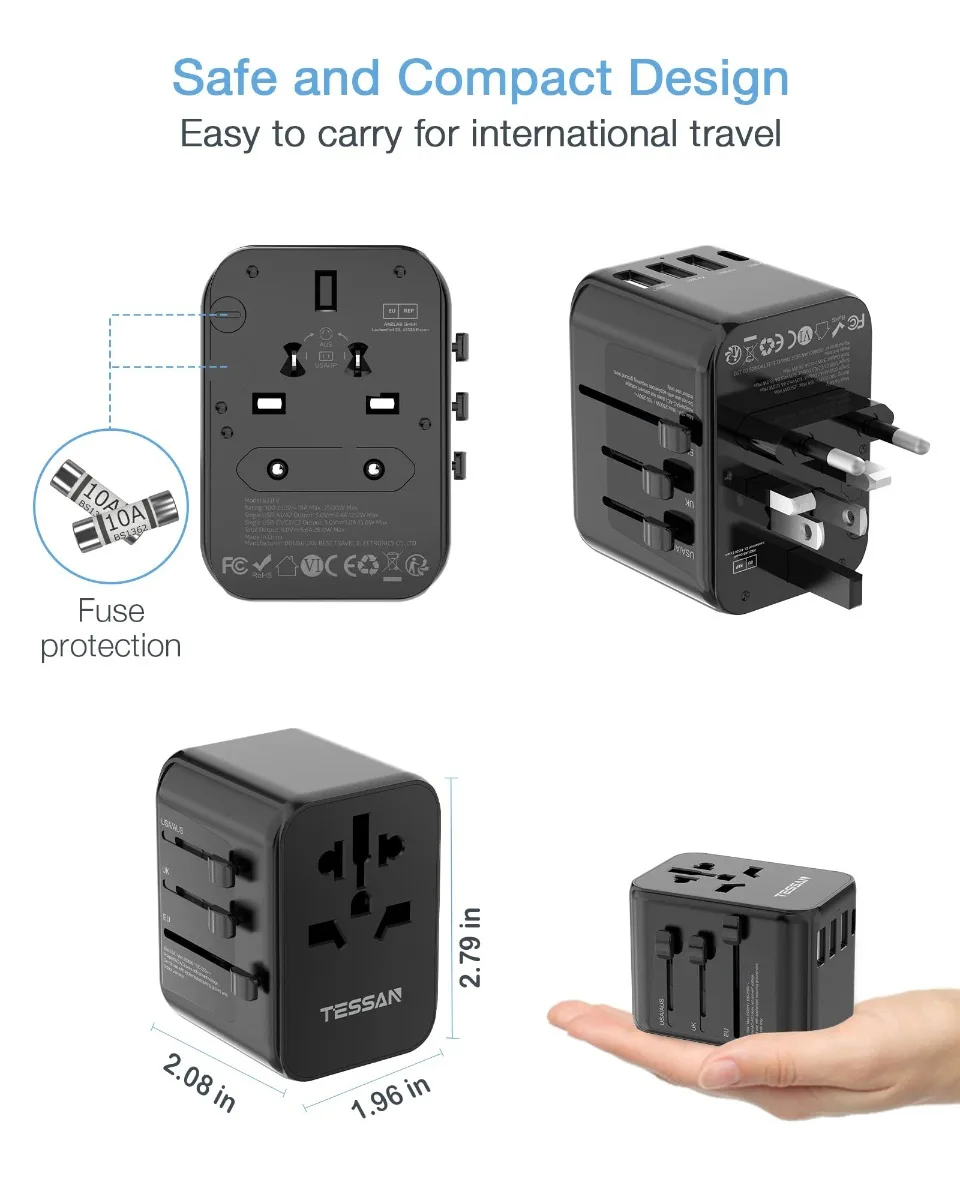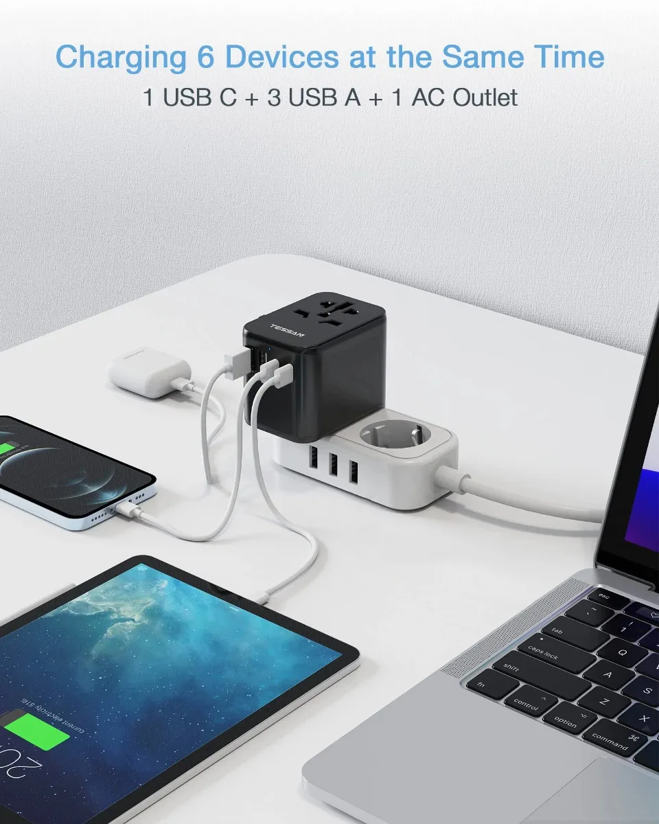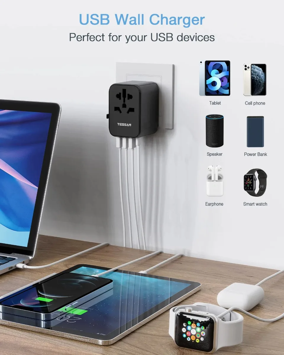 TESSAN 범용 여행용 어댑터, 3 USB 포트 및 1 USBC 포트 포함, 전 세계 사용 가능