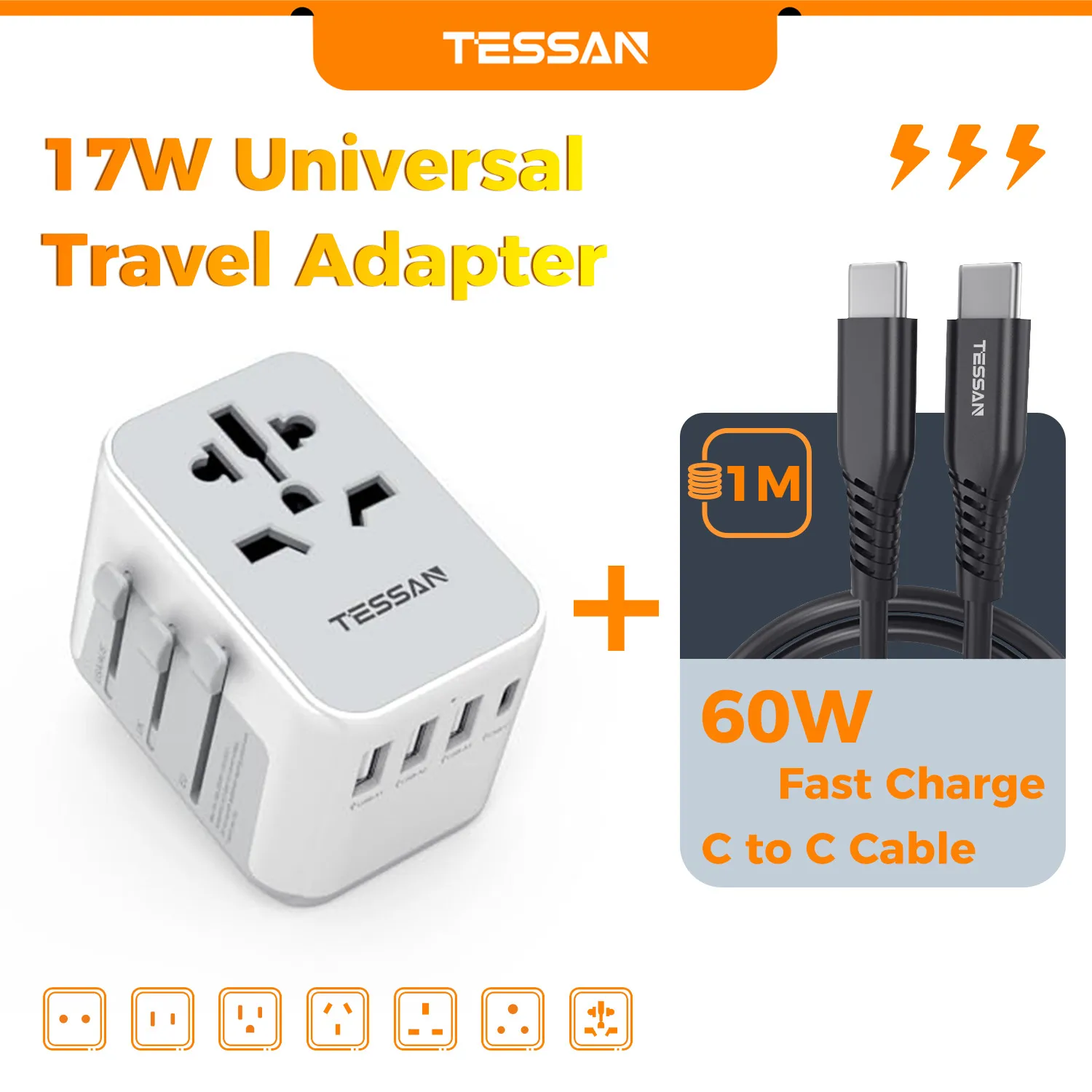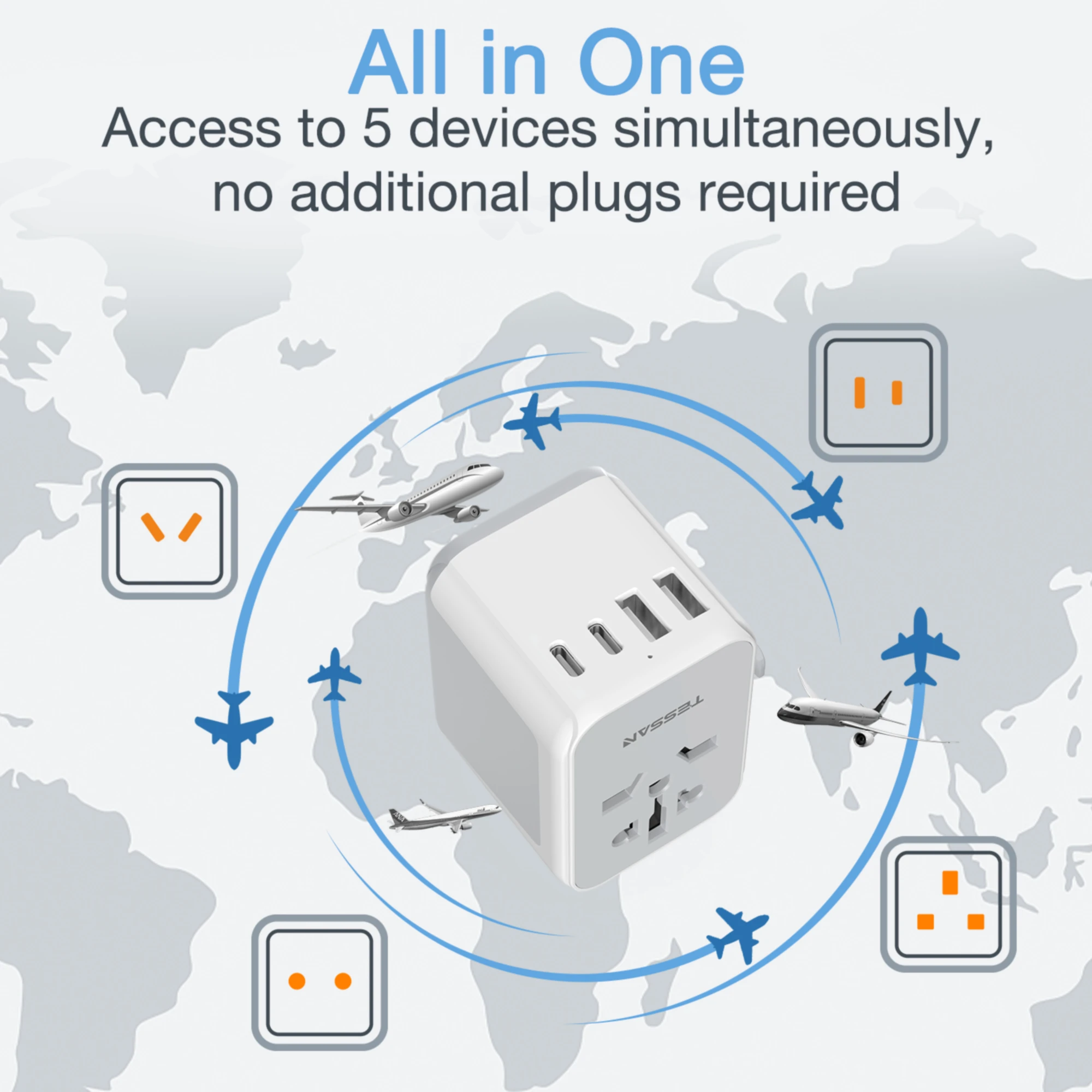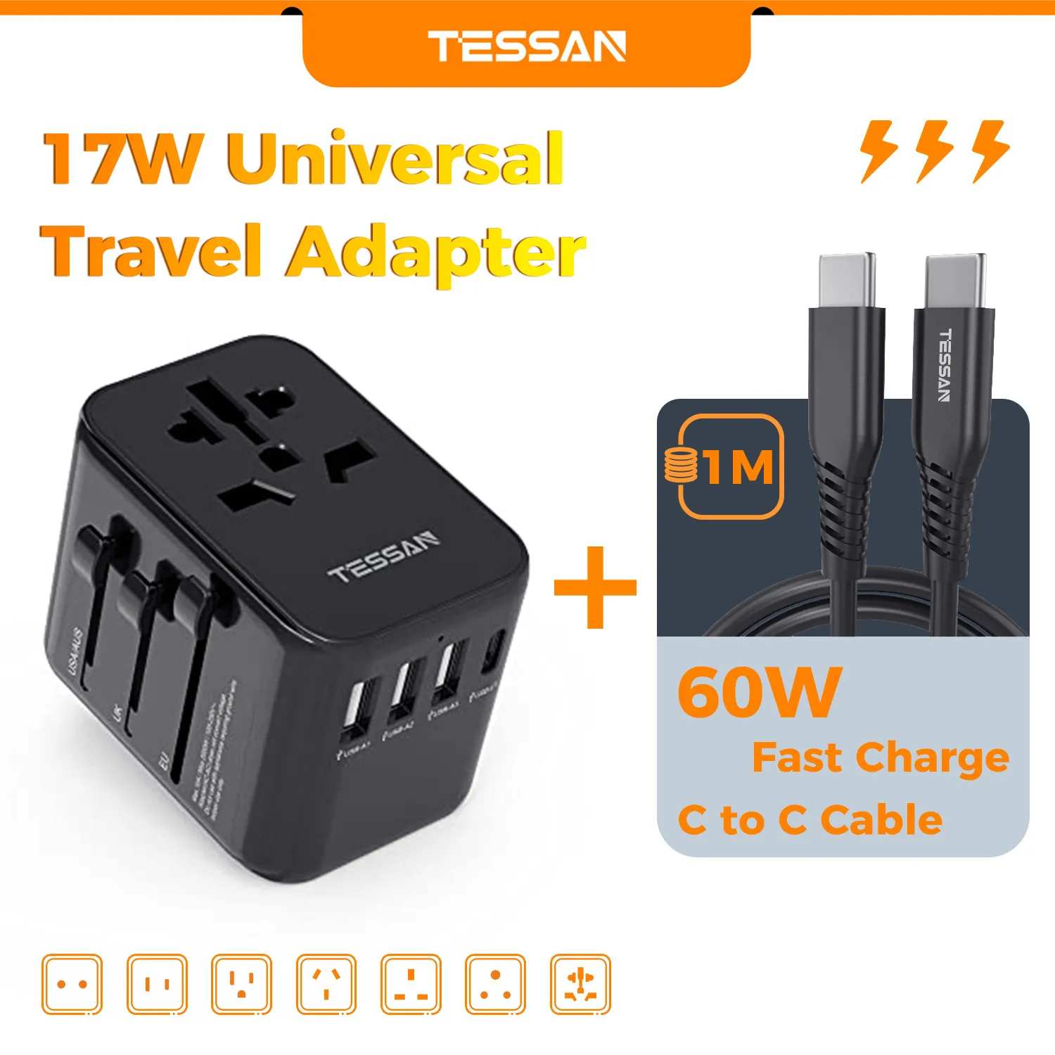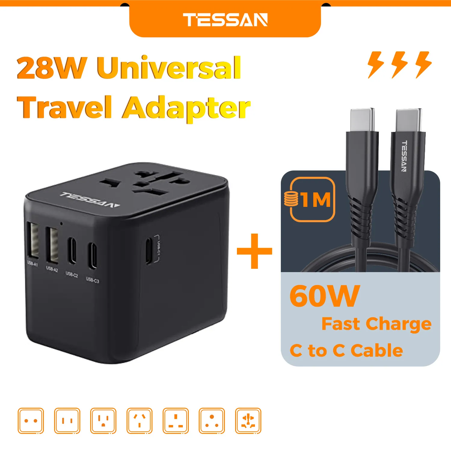 TESSAN 범용 여행용 어댑터, 3 USB 포트 및 1 USBC 포트 포함, 전 세계 사용 가능
