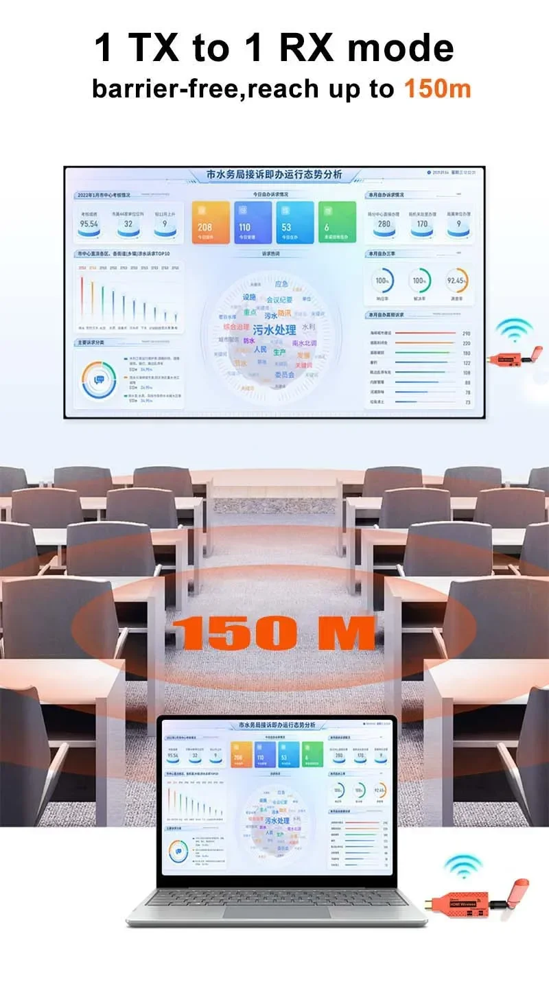 8.최대 150m까지 전송 가능하며 대부분의 대규모 회의실, 강의실, 연설장 등의 사용을 충족합니다.