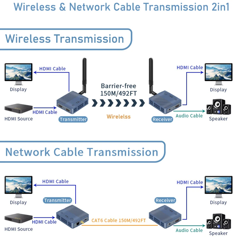 장애물 없는 개방된 공간에서 1 TX1 RX 모드로 사용 시 최대 150미터까지 도달 가능합니다.