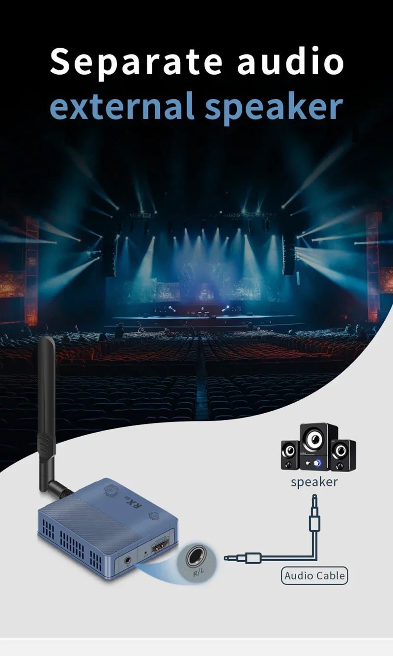 TX에는 1채널 로컬 루프아웃이 있고, RX에는 오디오 분리를 위한 3.5mm 오디오 출력이 있습니다.
