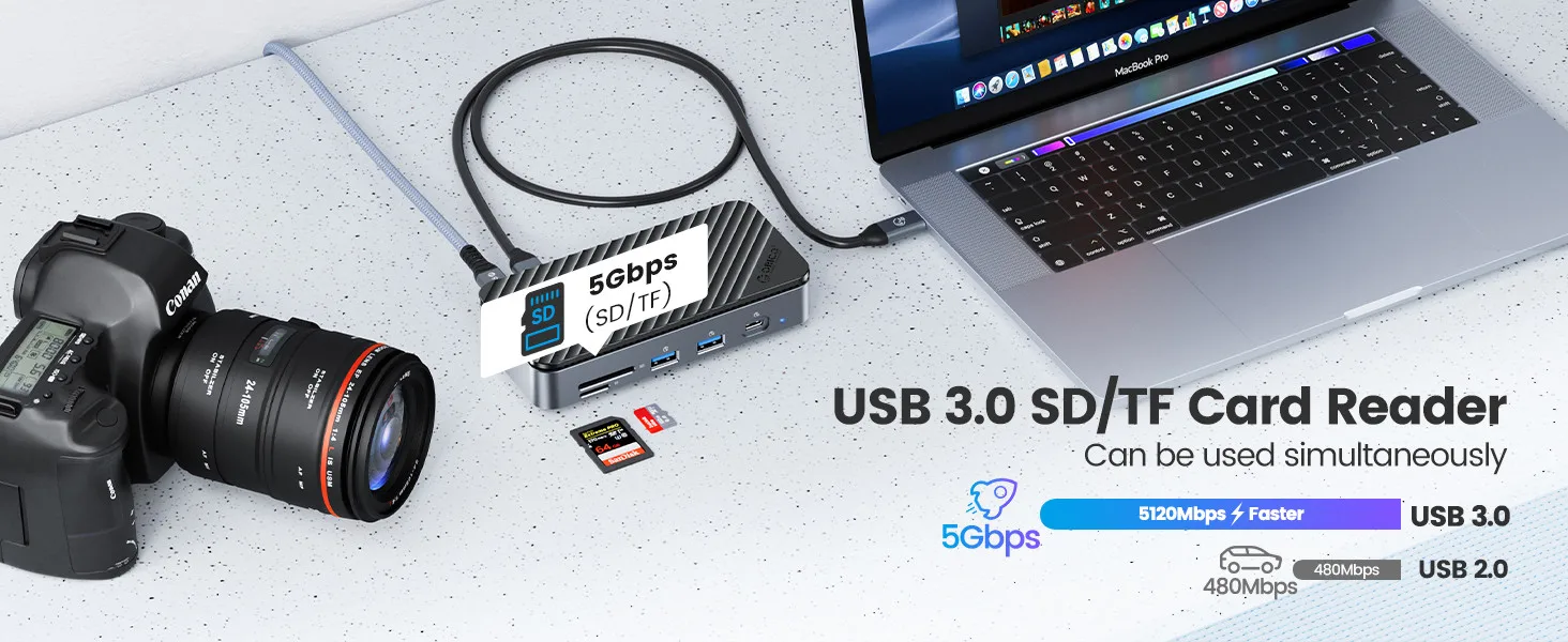 이 도크는 현장에서 작업하는 사진작가에게 훌륭한 솔루션이 될 수 있습니다. 도크에 대용량 NVME 드라이브를 장착하고 휴대용 모니터를 연결하기만 하면 SD/TF 카드에서 사진을 오프로드하고 클라이언트를 위해 사진을 편집할 수 있는 훌륭한 워크스테이션을 구성할 수 있으며, 여행 브이로거도 이 제품에서 동일한 이점을 찾을 수 있습니다. (USB 3.0 SD/TF 카드 리더를 동시에 사용할 수 있습니다.)