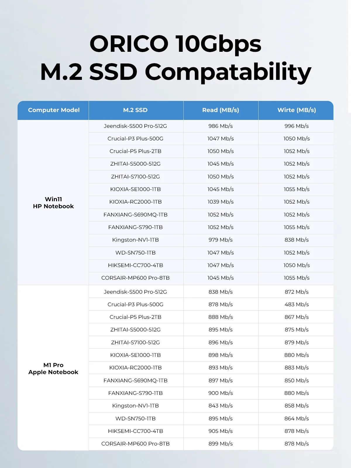 A: 제품의 작동 속도는 노트북, M.2 SSD 및 USB 포트 유형에 따라 결정됩니다. 가장 빠른 읽기 및 쓰기 속도를 위해서는 NVMeSSD를 사용해야 하며, M.2 SSD용 외부 인클로저는 USB 3.1 GEN2 10G 포트에 연결해야 합니다.