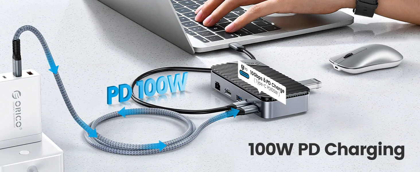 100W PD 파워로는 게이밍 노트북을 충전하기에 충분하지 않을 수 있지만, 강력한 CPU를 탑재한 대부분의 노트북을 충전할 수 있습니다. 노트북에 케이블 하나만 꽂으면 충전, 비디오, 스토리지가 모두 연결됩니다.