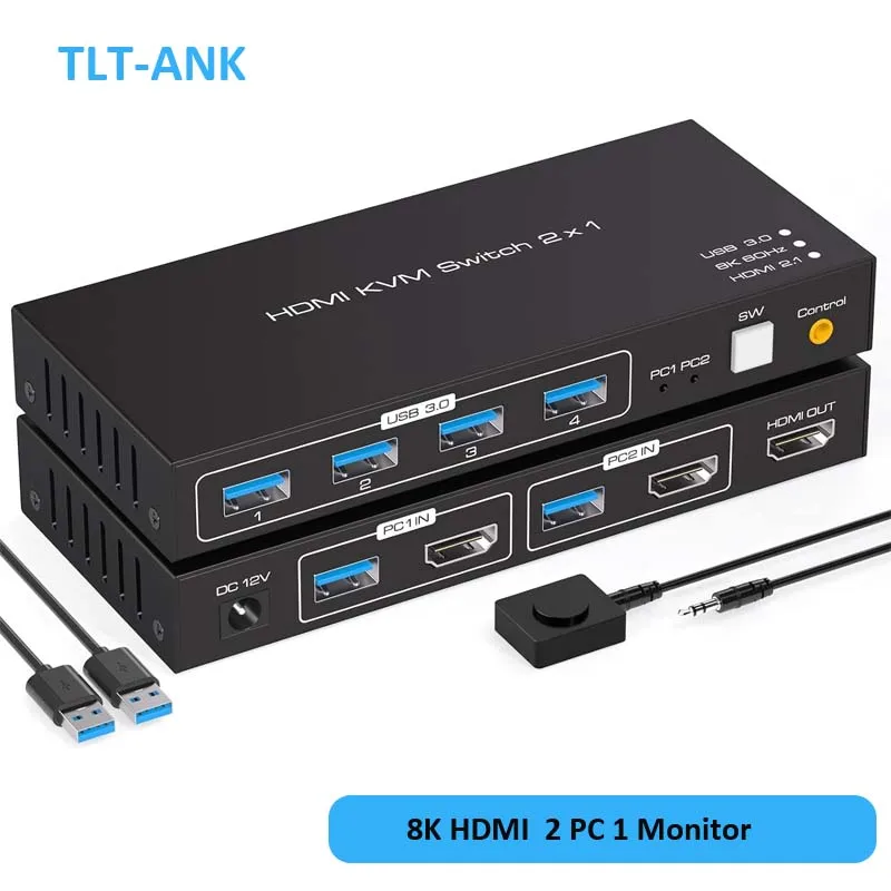 【HDMI 2.1 + 2 DP 1.4 KVM 스위치 2 스위칭 방법】 패널의 버튼을 누르거나 외부 케이블 컨트롤 (포함) 을 사용하여 2 대의 컴퓨터 사이를 전환 할 수 있습니다. 다양한 시나리오에 대한 다양한 전환 옵션을 제공합니다. LED 조명은 활성 장치를 보여줍니다. 비즈니스 미팅, 사무실, 감시실 및 홈 오피스에 이상적입니다. 참고: (3 대의 모니터는 한 번에 한 대의 컴퓨터에서만 입력 신호를 수신 할 수 있습니다)