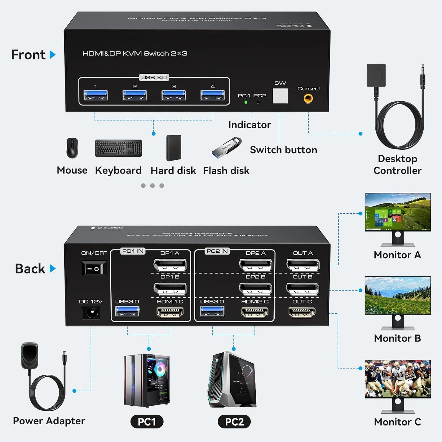 2 디스플레이 포트 + HDMI KVM 스위치 2 PC 3 모니터 4K144Hz 8K60Hz 2 컴퓨터 용 트리플 모니터 KVM 스위치 공유 3 모니터