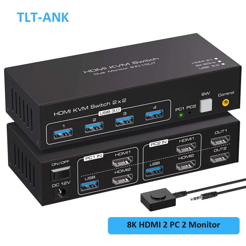 8K HDMI + 2 디스플레이 포트 KVM 스위치 3 모니터와 4 USB 3.0 포트를 공유하는 2 대의 컴퓨터 용 트리플 모니터