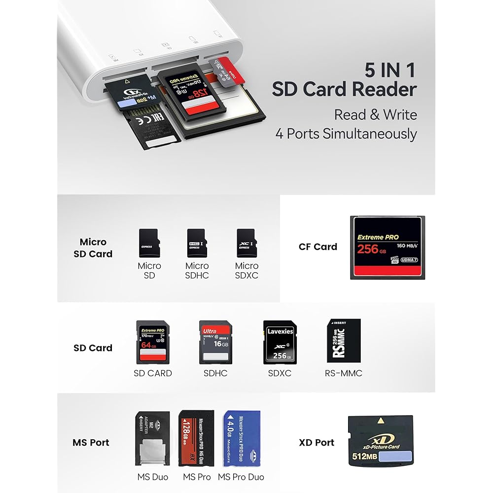 | Media Type | Memory Stick, microSD, CompactFlash, xD Picture Card, SD Card |