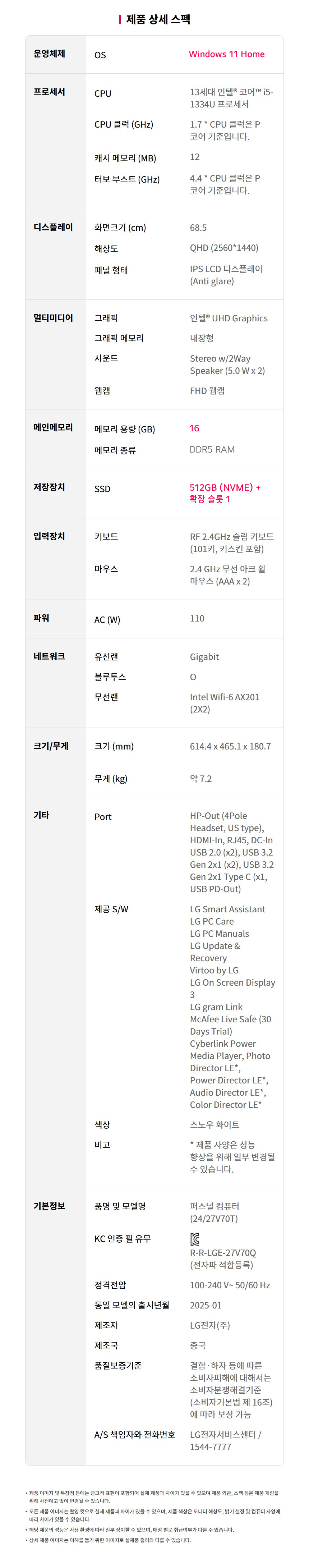 당일발송+한컴 LG 일체형 27VD70T-GX50K i5 16GB 512GB WIN11 Home / 사무 인강용 가성비 올인원 PC