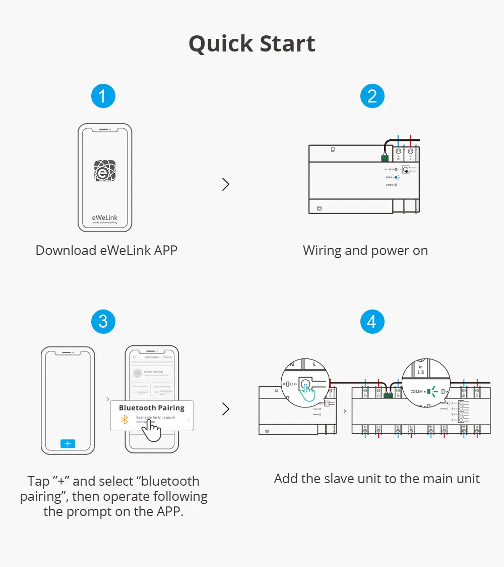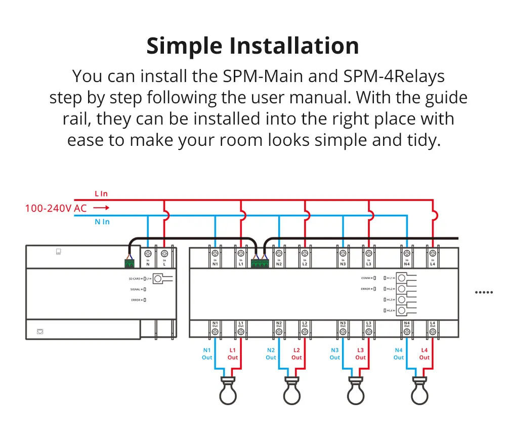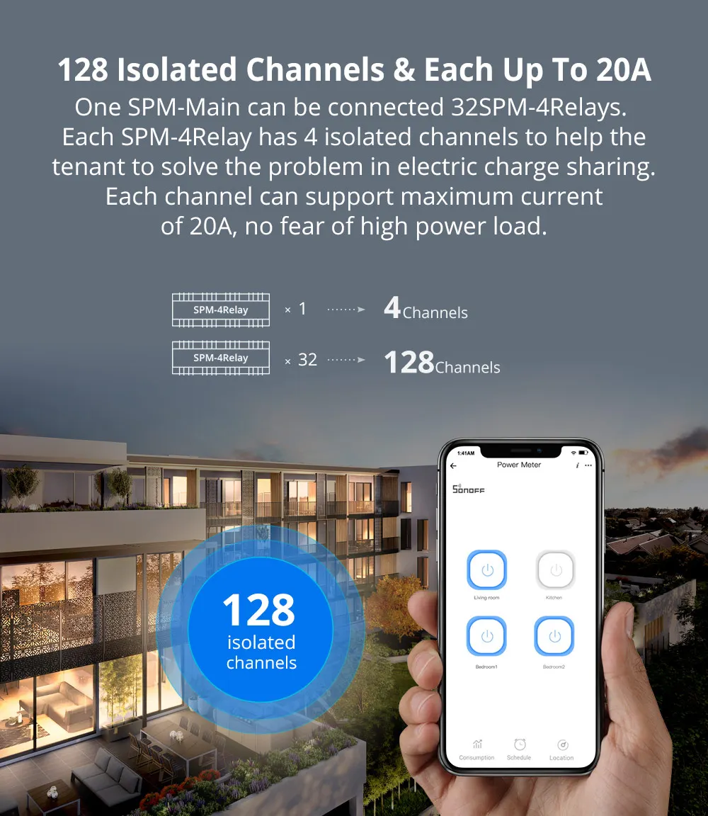 SONOFF Stackable Power Meter는 과부하 보호, 메타 데이터 모니터링 및 전기 통계 지원, 전원 켜기 상태 지원 (본체의 펌웨어, 4-릴레이는 버전 1.2.0 로 업그레이드되고 eWeLink 앱은 4.23.0 로 업그레이드됩니다. SPM-Main은 이더넷 또는 WiFi를 통해 클라우드와 통신하고 RS-485 통해 SPM-4Relays 통신하므로 다중 터미널과 안정적인 장거리 데이터 전송이 가능합니다.