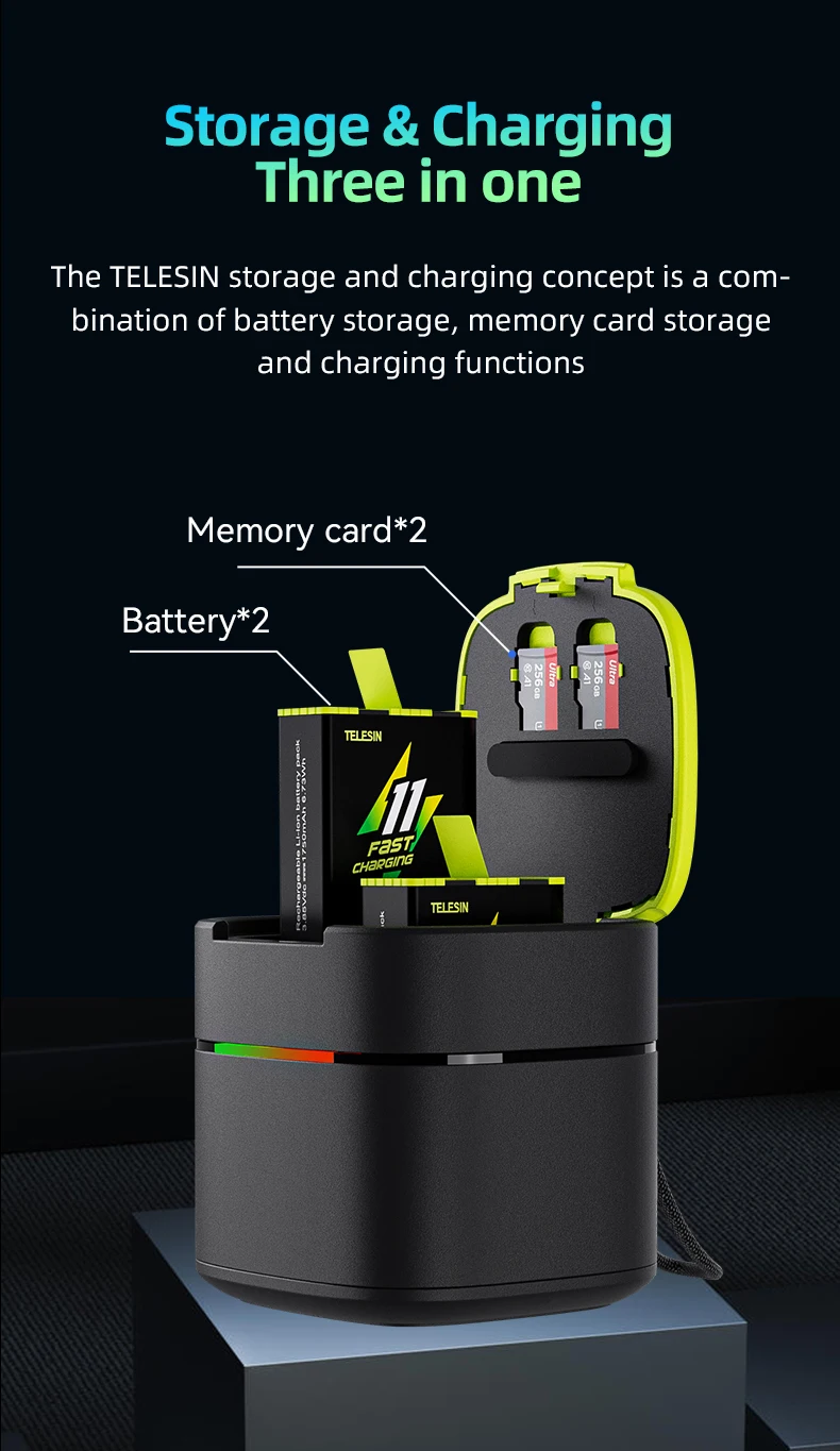 7. TELESIN 저장 및 충전 개념은 배터리 저장, 메모리 카드 저장 및 충전 기능의 조합