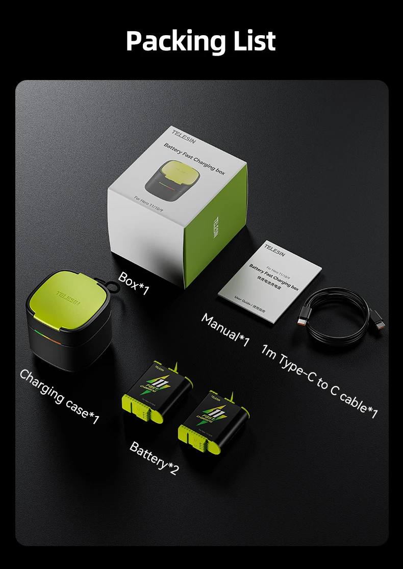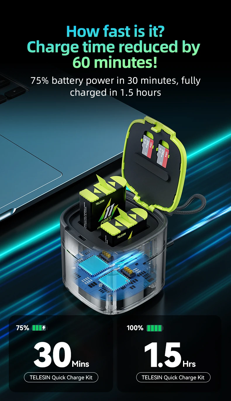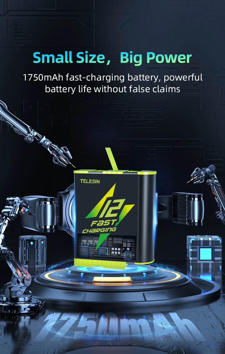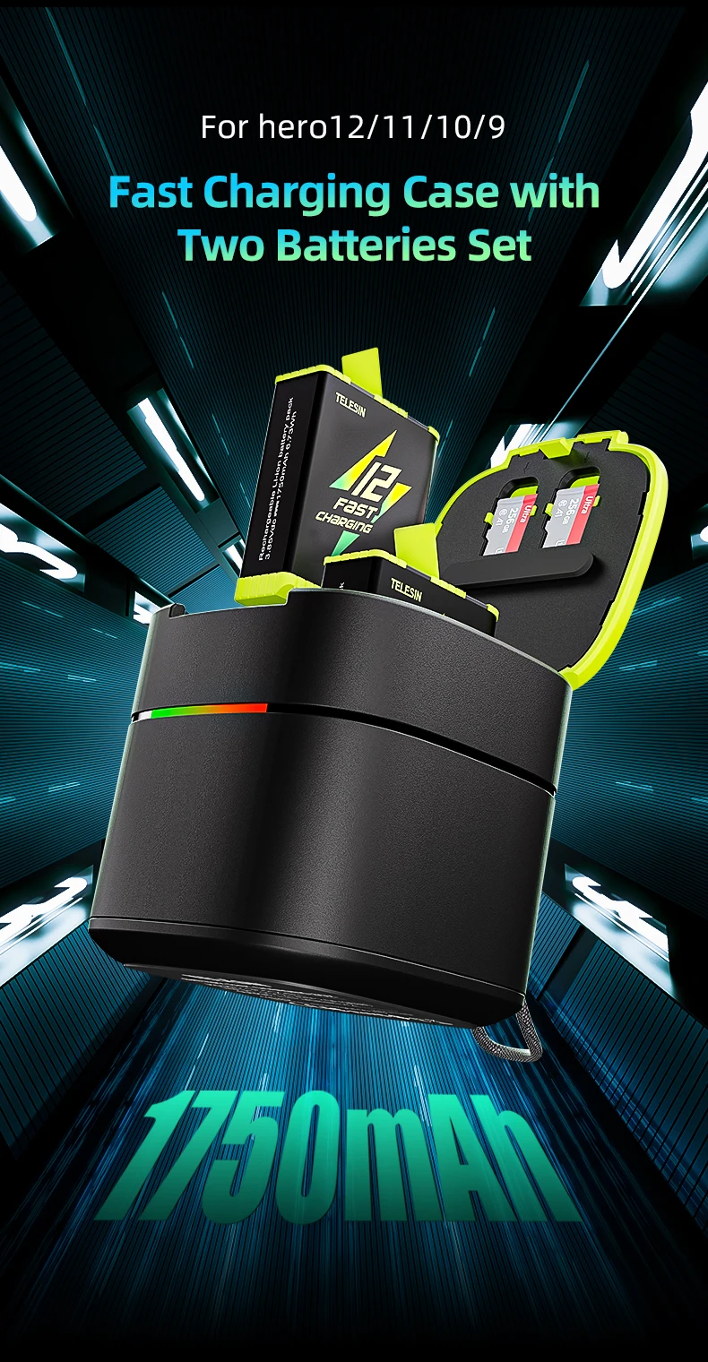 TELESIN 고속 충전 배터리 GoPro 12 영웅 12 11 10 9 1750 mAh 배터리 2 방법 고속 충전기 상자 TF 카드 보관 용 GoPro 12 11 10