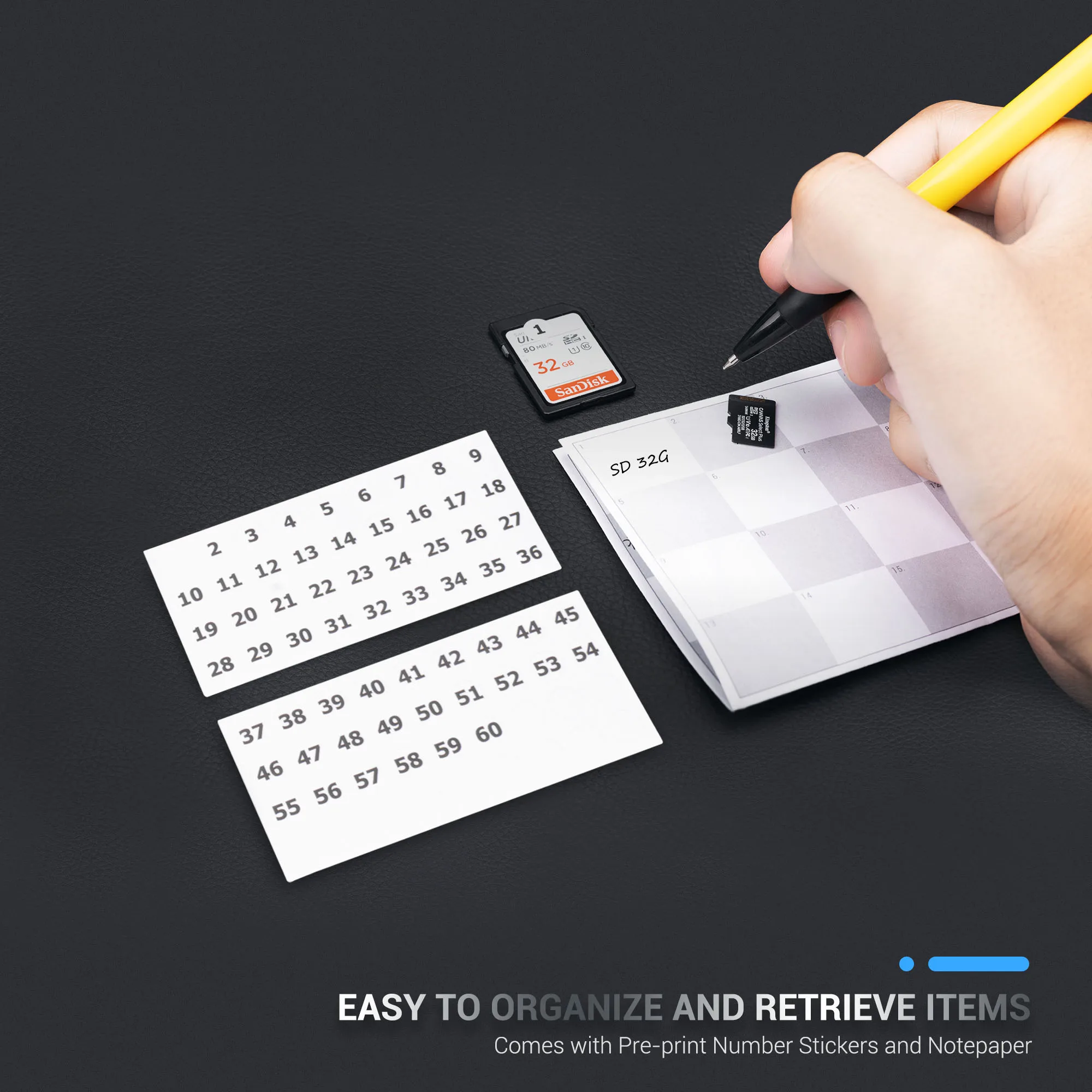 5. 사전 인쇄 번호 스티커 2 장과 메모지 1 장이 함께 제공되며, 항목을 정리하고 검색하기 쉽습니다.
