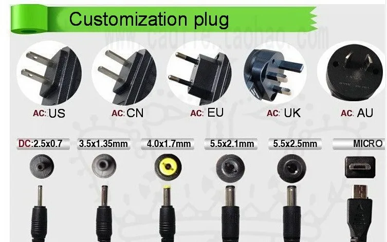 수많은 사용자 정의 잭 크기: 5.5mm x 2.5mm / 4.8mm x 1.7mm / 4.0mm x 1.7mm / 3.5mm x 1.35mm / 3.0mm x 1.1mm / 2.5mm x 0.7mm 또는 기타