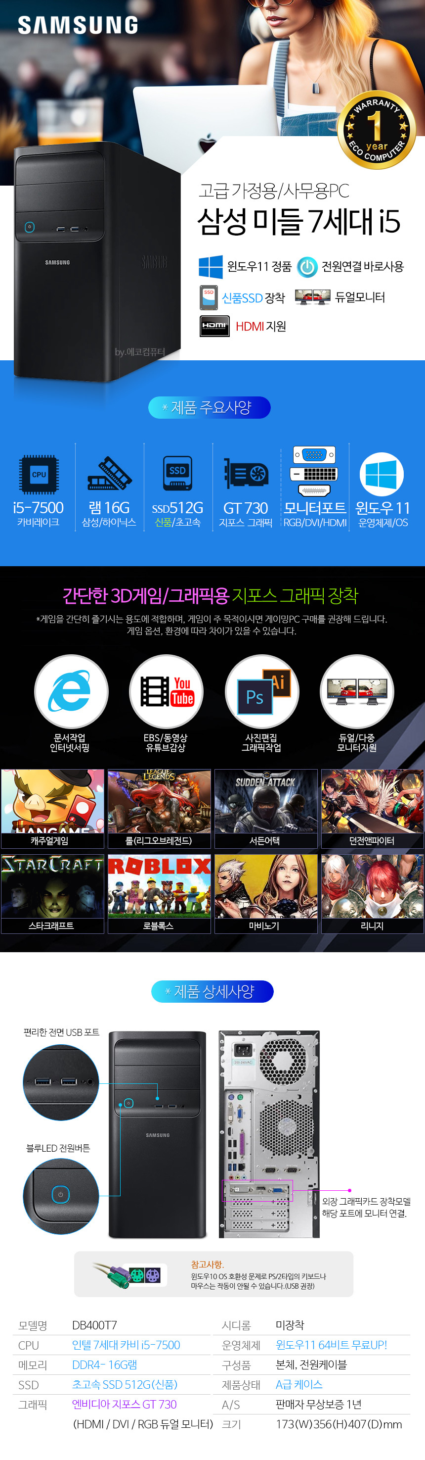 삼성 컴퓨터 본체 윈도우11 무상1년 데스크탑 PC 7세대 i5-7500 16G S512 GT730 HDMI