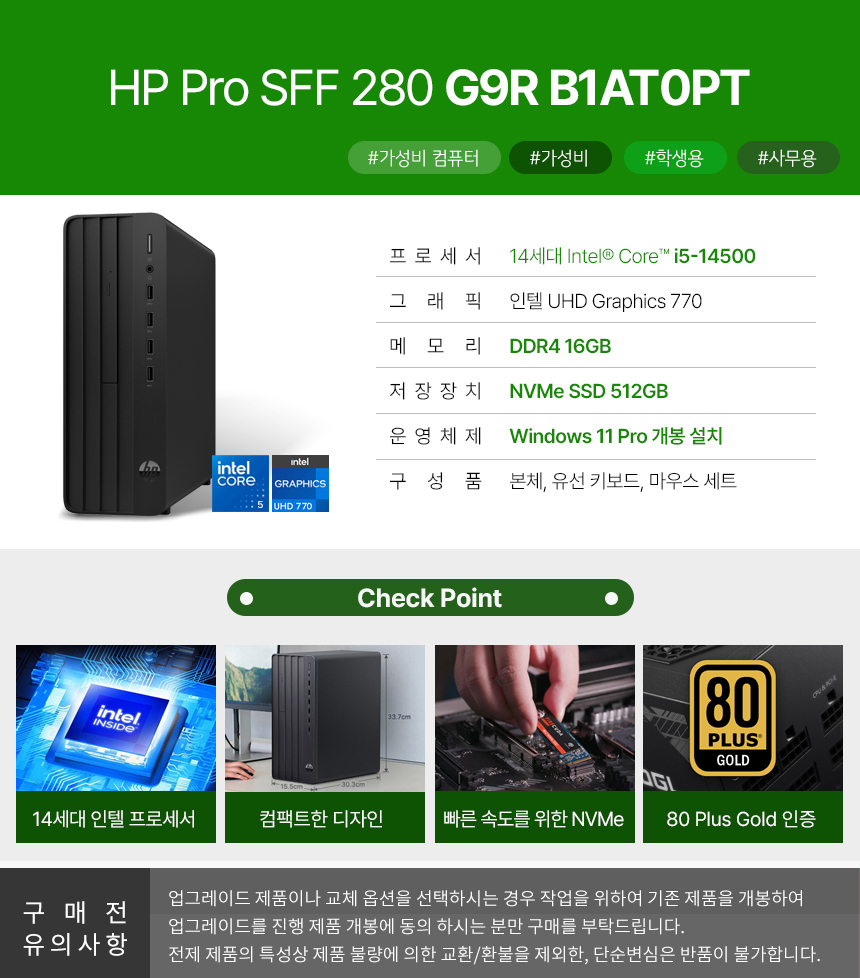 HP Pro SFF 280 G9R B1AT0PT Win11Pro i5 16GB 512GB 사무용 학생용 가성비 컴퓨터 (A)