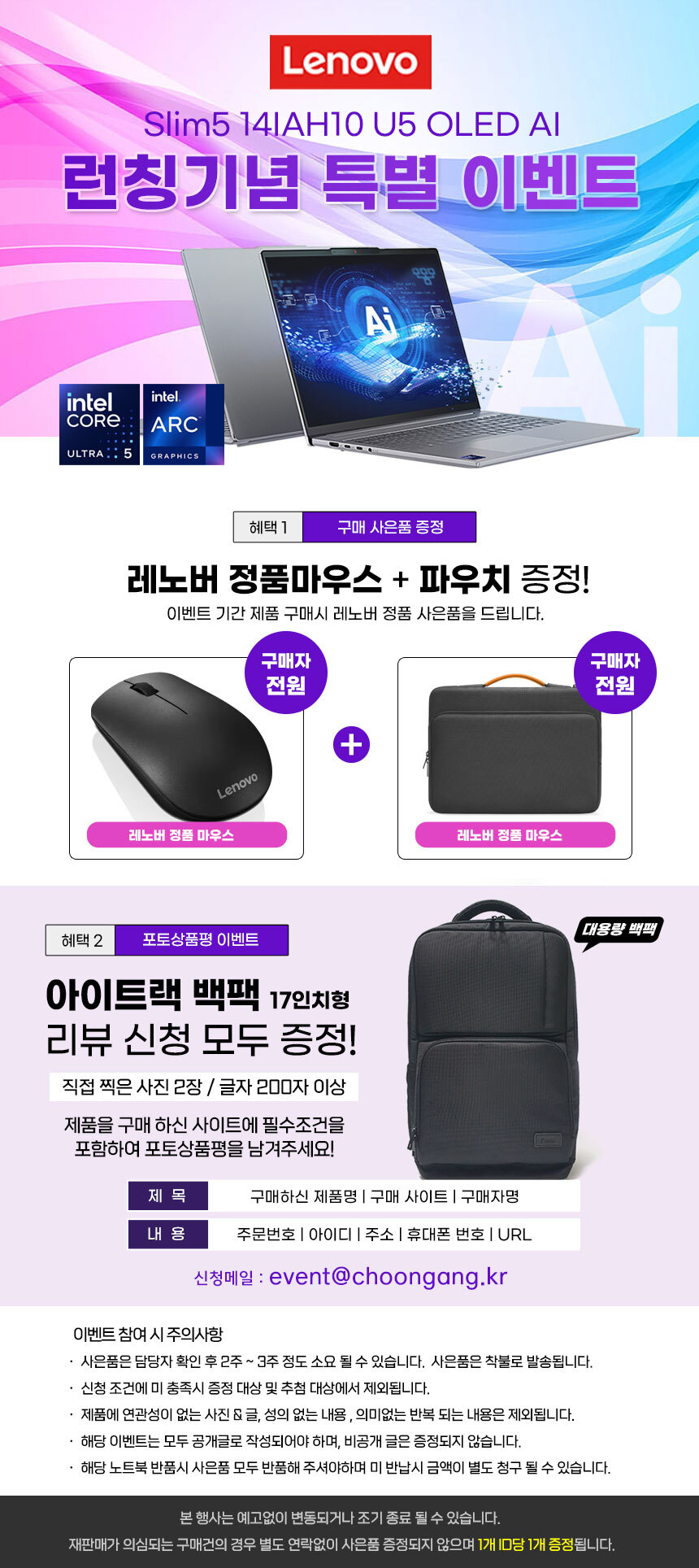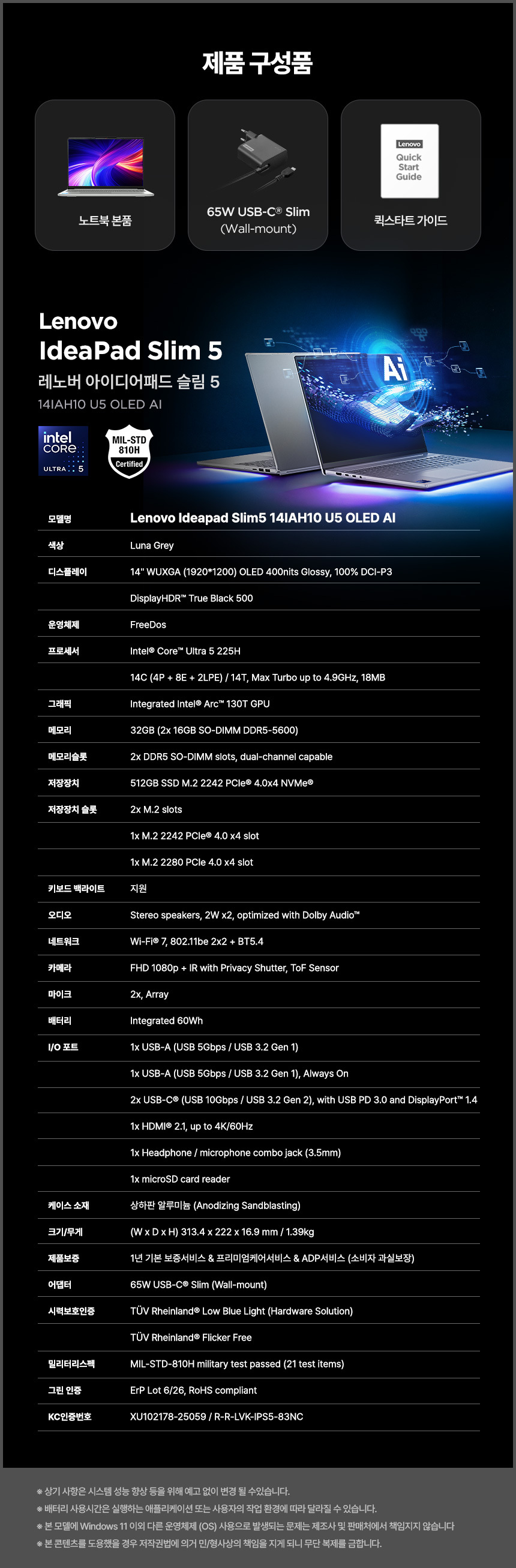 레노버 Slim5 14IAH10 U5 OLED AI 32GB 최대혜택가95만/U5 225H/Arc 130T/RAM32GB/OLED 400니트/Wi-Fi 7/1.39kg
