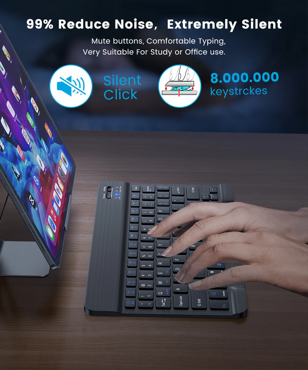 {안정적인 블루투스 연결}블루투스 키보드는 페어링하고 연결하기 쉽고 사용하기 쉽습니다. 고급 Bluetooth 기술은 지연이나 드롭 아웃없이 최대 10m 까지 강력하고 안정적인 연결을 제공합니다. 가위 스위치 키보드는 타이핑을 편안하고 조용하게 만듭니다. 재생/일시 중지, 볼륨, 앞뒤와 같은 멀티미디어 단축키가 장착되어있어 워크 플로우 및 생산성을 높일 수 있습니다.