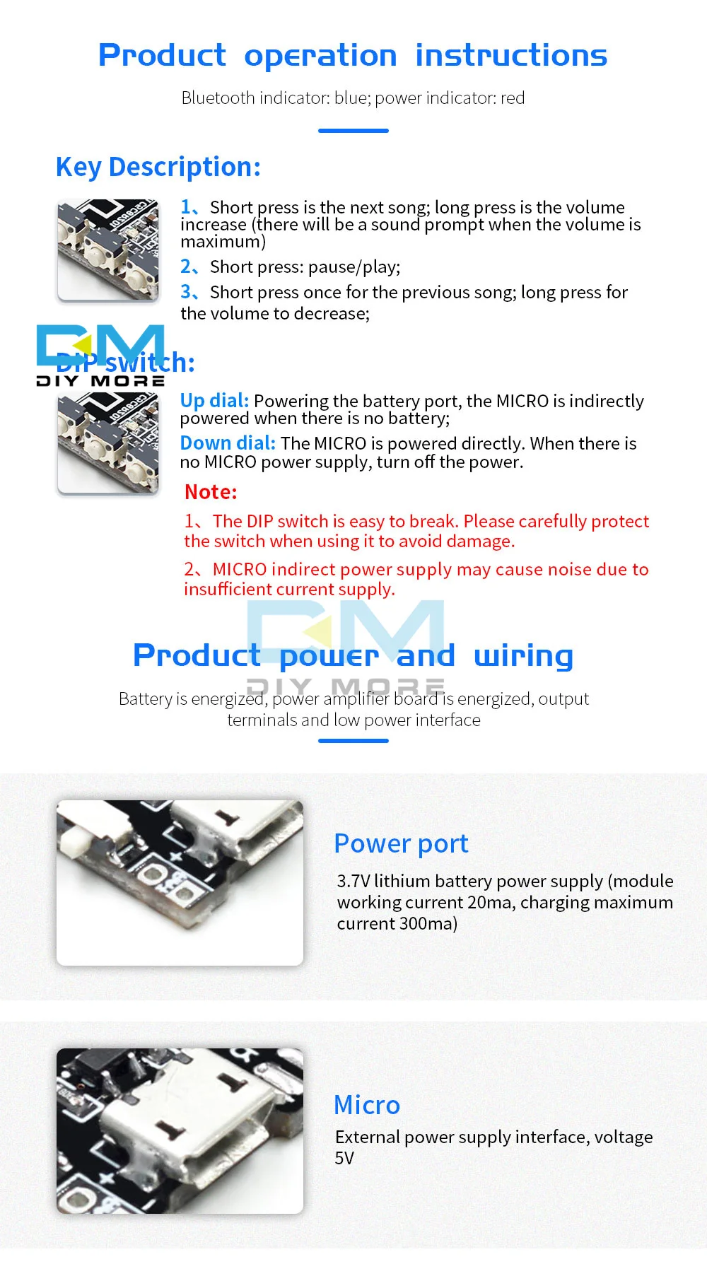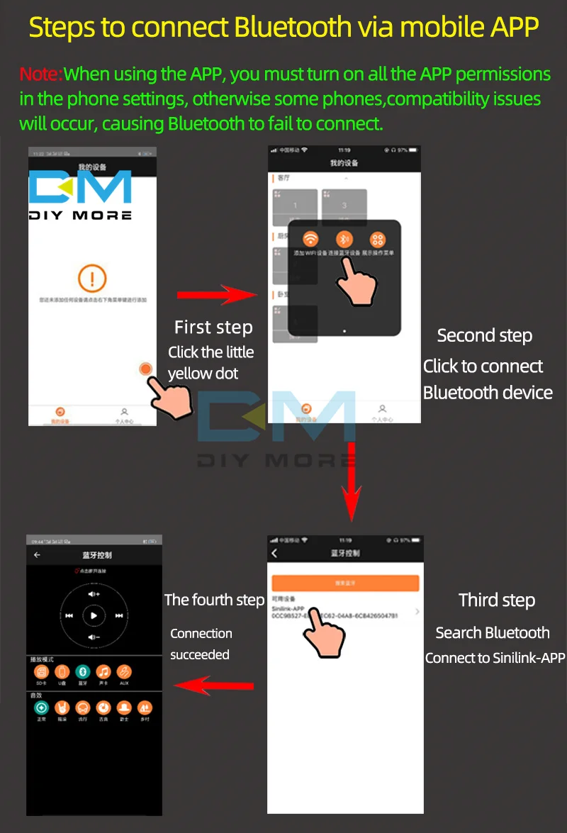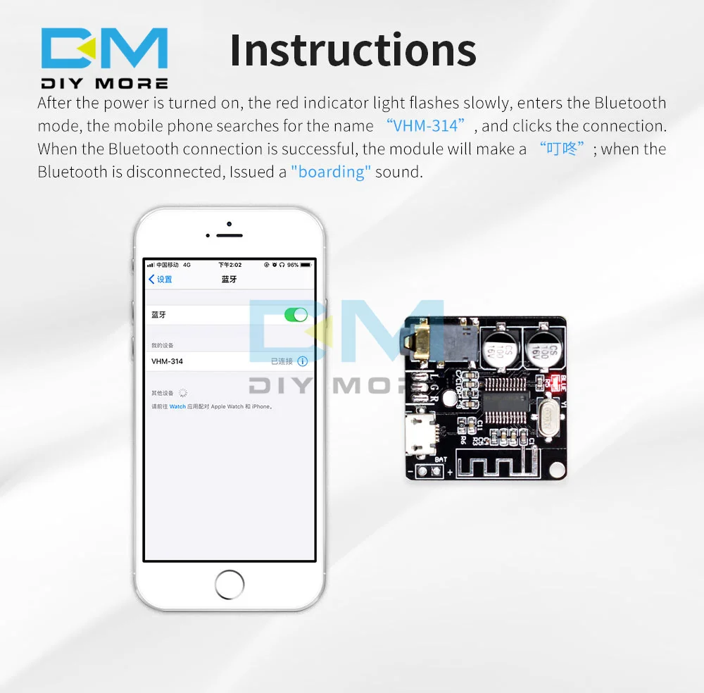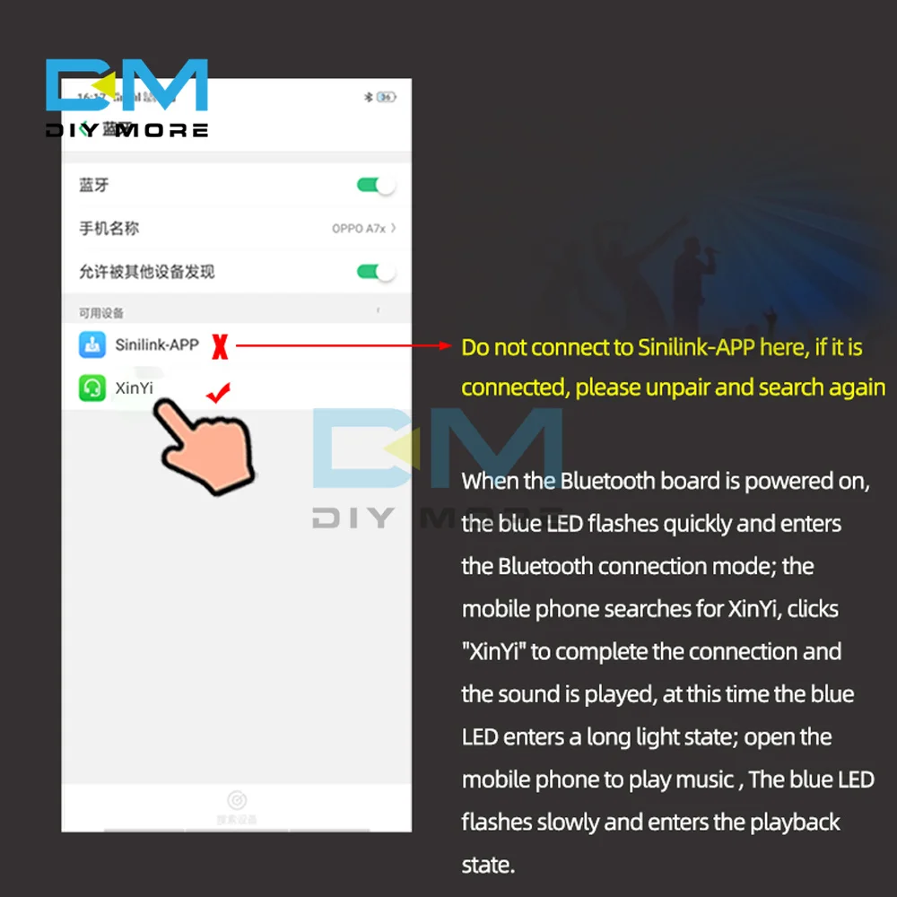 전원이 켜지면 파란색 표시등이 켜지고 Bluetooth 모드로 들어갑니다. 영어 '''''Bluetooth 장치를 페어링 할 준비가되었습니다 '가 표시됩니다. Bluetooth 모드가 입력되고 페어링 대기 중임을 나타냅니다. 휴대 전화 Bluetooth에서 검색된 'XY _ BT' 는 디코딩 보드의 장치 이름입니다., 연결을 클릭하면 디코더 보드에 '블루투스 장치가 성공적으로 연결되었습니다' 라는 메시지가 표시되어 디코더 보드와 휴대 전화가 성공적으로 연결되었으므로 음악을 재생할 수 있습니다.
