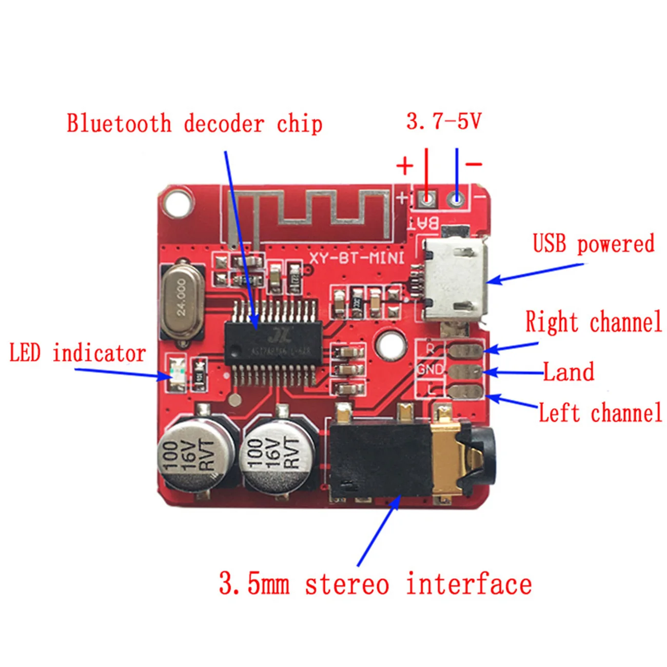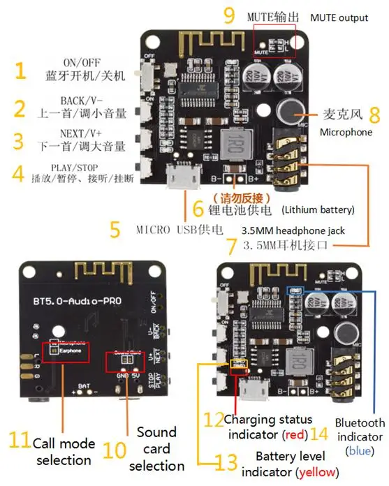 이 때 충전 및 방전 모드로 전환하면 Bluetooth가 자동으로 다시 시작되고 자동으로 연결되고 이전 재생 상태가 유지됩니다.) 수신 음성 통화 기능: Bluetooth가 연결된 후, bluetooth 설정에서 통화 오디오 모드를 켭니다. 전화가 걸리면 재생/중지 버튼을 통해 전화를 받거나 전화를 끊을 수 있습니다. 원래 헤드셋의 마이크 (헤드셋에 4 세그먼트 유형의 통화 기능이있는 경우) 또는 온보드 마이크 (기본값) 에서 보내도록 선택할 수 있습니다. 자세한 내용은 함수 설명을 참조하십시오. 컴퓨터 사운드 카드를 사용할 때: 모듈 뒷면의 사운드 카드에 해당하는 두 상자의 패드를 주석 처리하고, 그런 다음 사운드 카드로 사용할 수있는 USB 케이블을 통해 컴퓨터의 USB 인터페이스에 연결하십시오. 즉, 컴퓨터에서 재생되는 사운드는 모듈의 오디오 인터페이스를 통해 출력됩니다. 자세한 내용은 함수 설명을 참조하십시오. (기본적으로 활성화되지 않음) 제품 크기: