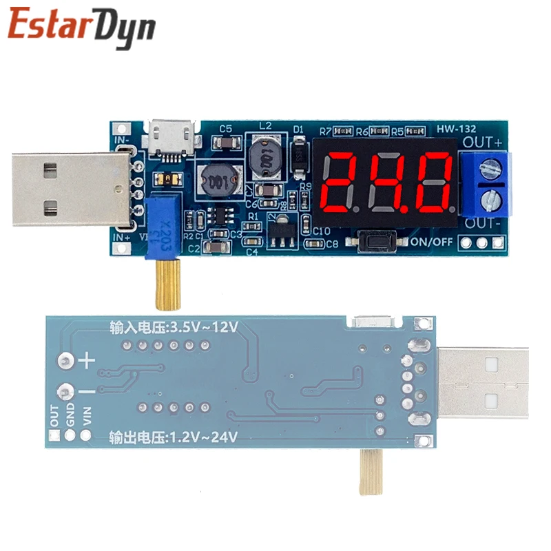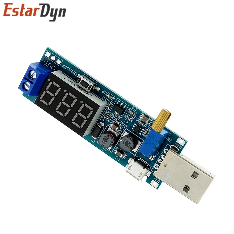 USB로 구동되는 USB 부스트/벅 전원 공급 장치 모듈은 전위차계를 조정하여 필요한 전압을 얻습니다.