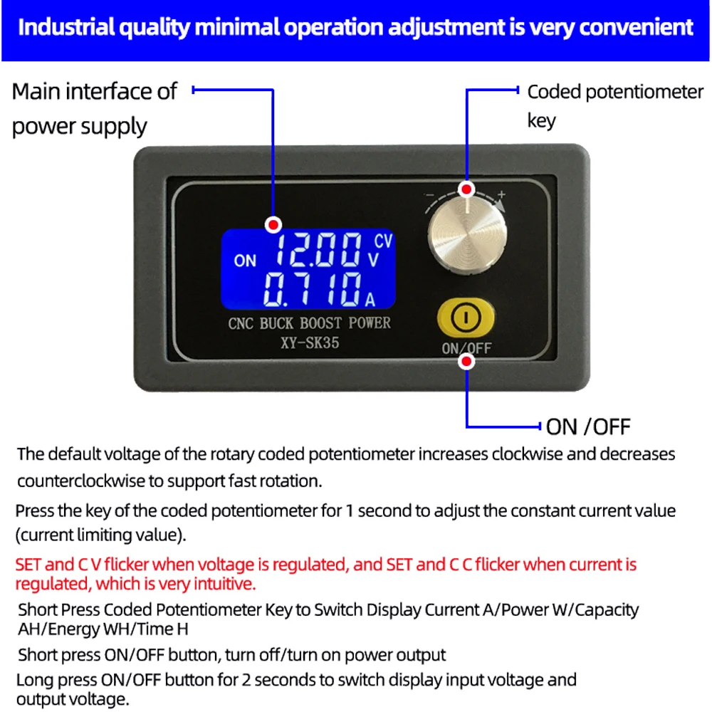3. 이 제품에는 잠금 기능이 있습니다.코드 전위차계 버튼을 5 초 동안 누르고 설정된 전압 및 전류를 잠그고 오작동을 방지하십시오! 잠금 후 코드 전위차계 버튼을 5 초 동안 눌러 잠금을 해제하십시오!4. 제품 사용 방법:4.1. 과전압/과전류/과전력/과온도/저전압 보호 기능이있는 일반적인 부스트 앤 드롭 전원 공급 장치.(1) 전압 값 설정.(2) 일정한 전류 값 (과전류 보호 값) 을 설정하십시오. (예를 들어, 상수 전류 값이 3.00A 이면 제품의 최대 전류는 3A 에 도달 할 수 있습니다. 전류가 3A 에 도달하면 액정에 "CC" 상태가 표시됩니다. 그렇지 않으면 액정에 "CV"상태.)4.2. 배터리 충전기로 사용정전류 기능이없는 제품은 배터리를 충전하는 데 사용할 수 없습니다. 배터리와 충전기의 전압 차이가 크기 때문에 충전 전류가 너무 커서 배터리가 손상되었습니다. 따라서 배터리는 처음에는 일정한 전류로 충전되어야합니다. 충전이 일정 수준에 도달하면 배터리를 자동으로 정전압 충전으로 다시 전환해야합니다.(1) 필요한 충전식 배터리의 부동 충전 전압과 전류를 결정하십시오. (리튬 배터리 파라미터가 3.7V/2200 mAh인 경우 부동 충전 전압은 4.2V, 12V 충전식 배터리인 경우, 플로팅 충전 전압은 일반적으로 약 14V 로 설정 됨).(2) 무부하 상태에서 출력 전압이 부동 충전 전압에 도달하도록 전압 값을 설정하십시오. (3.7V 리튬 배터리를 충전하는 경우 출력 전압을 4.2 V로만 조정하십시오)(3) 무부하 상태에서 일정한 전류 값 (배터리의 충전 전류) 설정;(4) 배터리를 연결하고 충전하십시오.4.3. LED 정전류 드라이버로 사용(1) 구동해야하는 LED의 작동 전류 및 최대 작동 전압을 결정하십시오.(2) 무부하 상태에서 출력 전압이 LED의 최대 작동 전압 및 전류에 도달하도록 전압 및 전류 값을 설정하십시오.(3) LED를 연결하고 테스트하십시오.이 제품은 LED 극성 디밍을 달성하기 위해 일정한 전류 값 (0 과 작동 전류 사이) 을 조정할 수 있습니다.5. 기능 세부 사항5.1 용량/에너지/실행 시간 통계:ON 후 통계가 자동으로 시작됩니다. OFF 후 마지막 상태의 값이 표시됩니다. ON을 다시 켜면 녹음이 자동으로 시작됩니다. 해당 인터페이스에서 ON/OFF 버튼을 3 초 동안 누르면 해당 데이터가 자동으로 지워집니다.최대 용량/최대 에너지/최대 실행 시간 설정 5.25.2.1. 최대 용량 (OAH)/에너지 (OPH) 설정: OAH/OPH 기능이 활성화되면 통계 용량/에너지가 최대 용량/에너지 세트보다 높을 때, 전원 공급 장치가 자동으로 출력을 종료하고"오 "/'오'; 알람이 해제되면 용량/에너지 통계가 자동으로 지워집니다.5.2.2. 최대 방전 시간 (OHP) 설정: OHP 기능이 활성화되면 전원 공급 장치가 설정된 최대 방전 시간보다 오래 작동 할 때, 전원 공급 장치가 자동으로 출력을 닫고 깜박여 "OHP" 를 표시합니다. OHP 경보가 해제 된 후 자동 지우기 시간 통계.