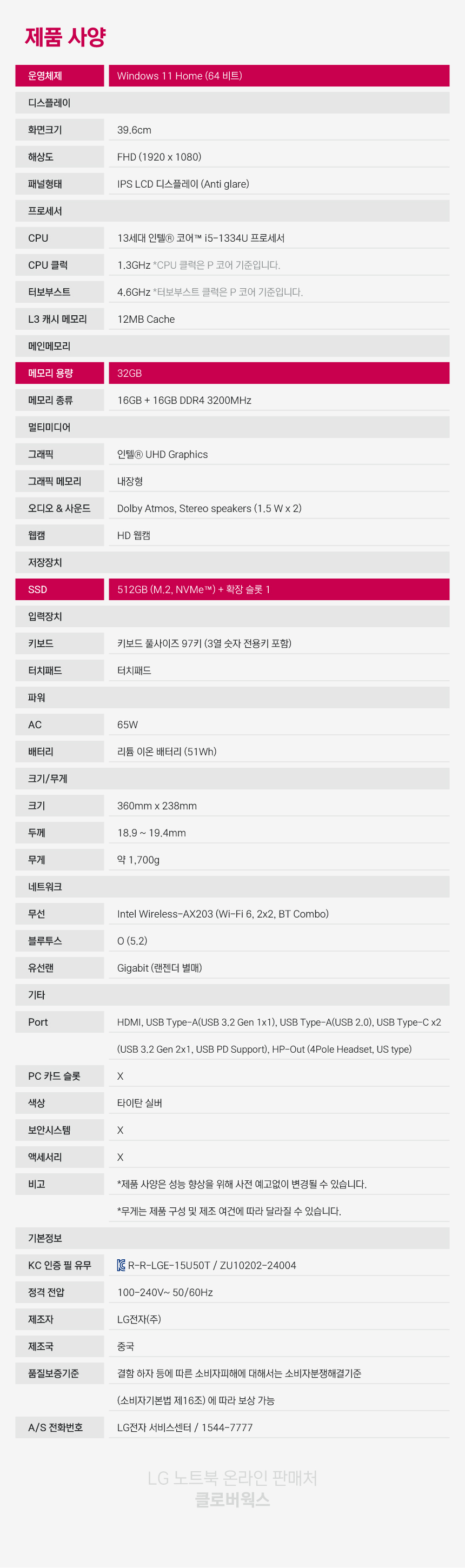 LG 울트라PC 15U50T-G.AR50K i5-1334U 32GB 512GB WIN11 / 가성비 좋은 사무 인강 대학생 노트북