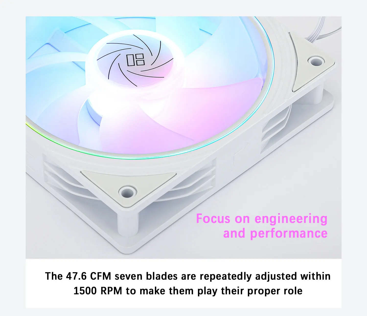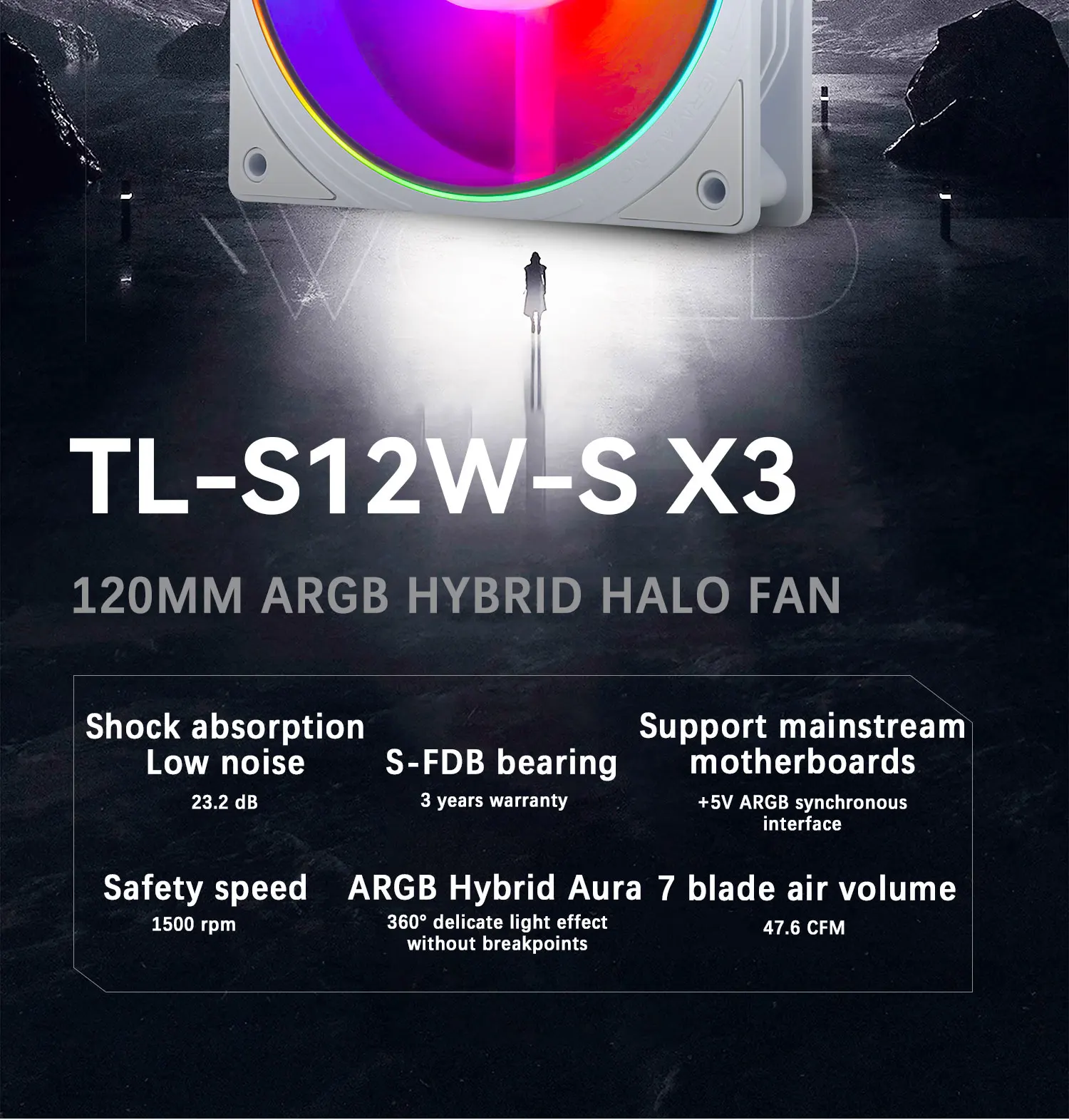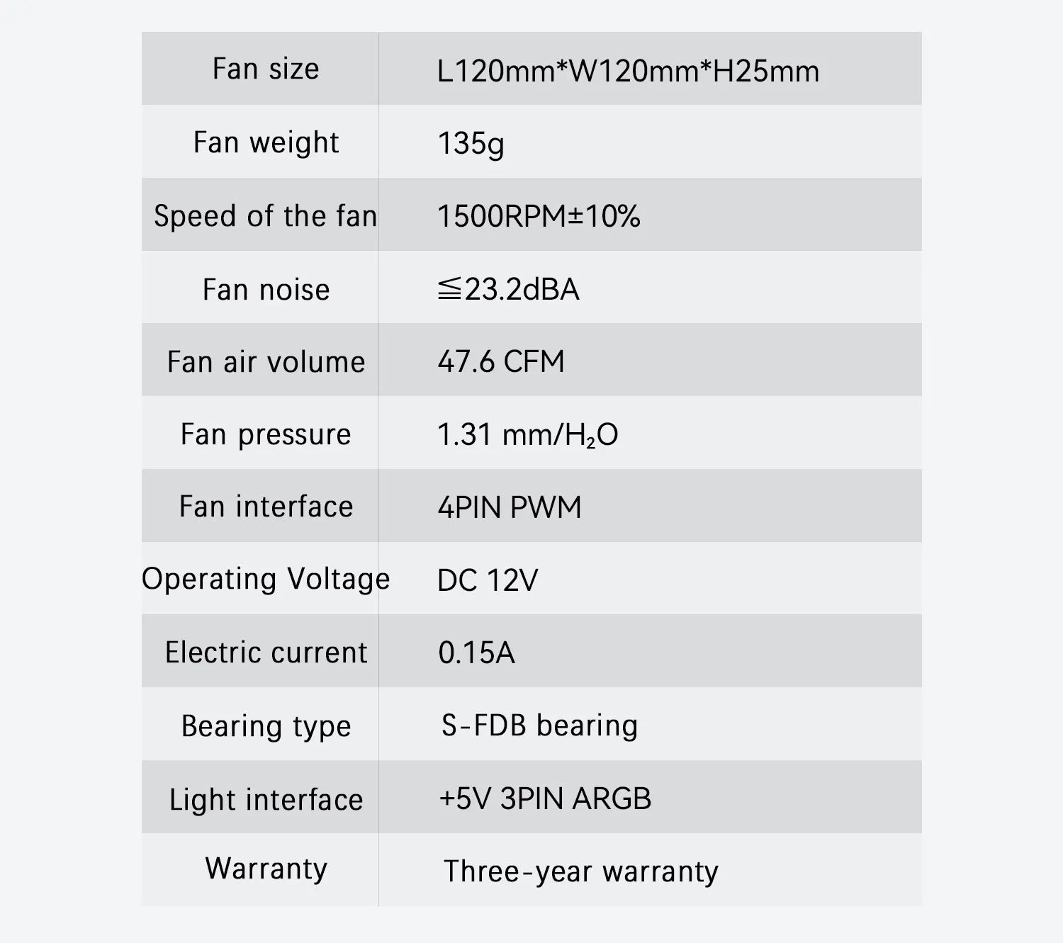 치수: L120 mm x W120 mm x H25 mm 정격 속도: 1500 RPM ± 10% 노이즈 레벨: 23.2 dBA 공기 흐름: 47.6 CFM 기압: 1.31mm/H2O 정격 전압: 12V DC 커넥터: 4 PIN PWM ARGB 커넥터: 3 PIN 5V 베어링 유형: S-FDB 베어링