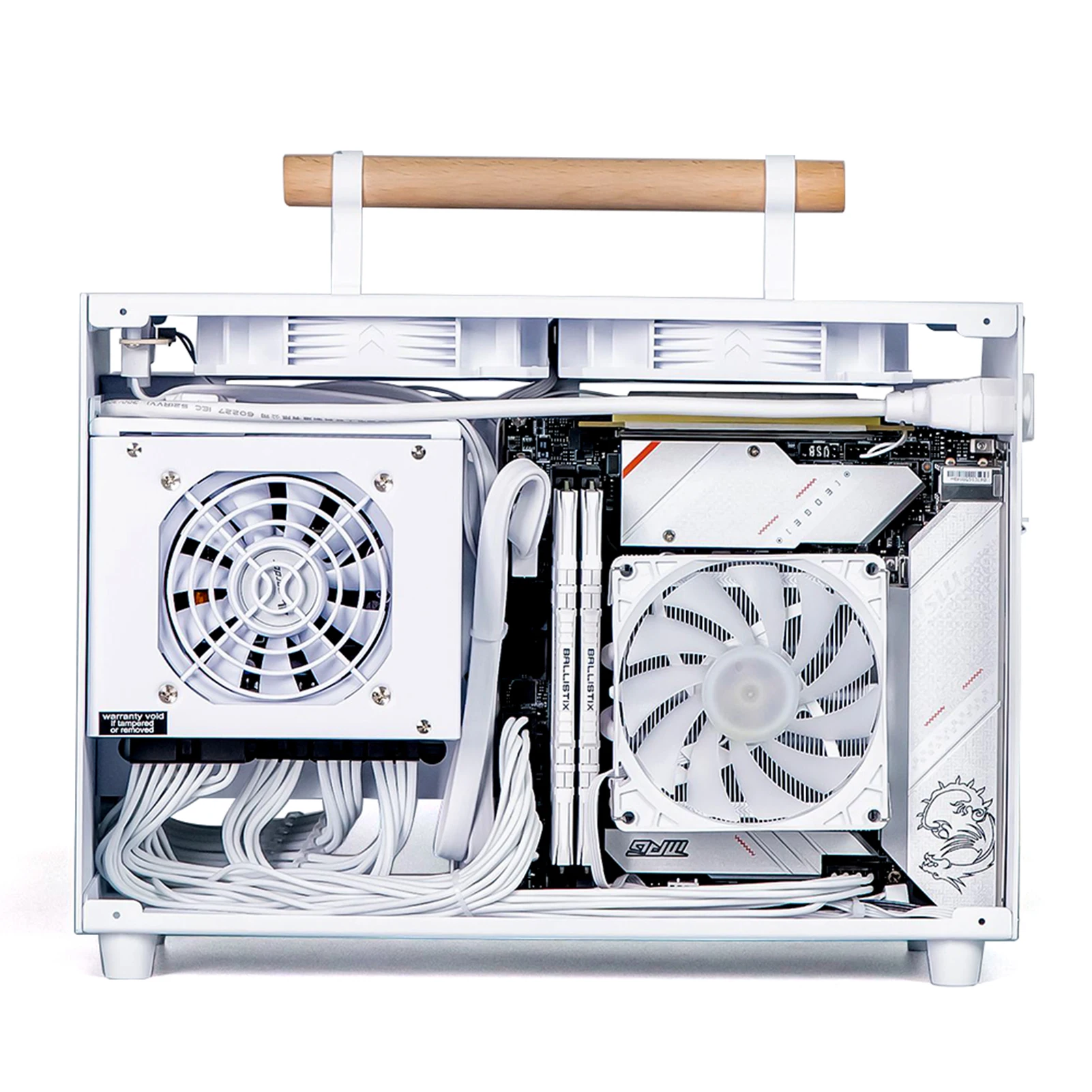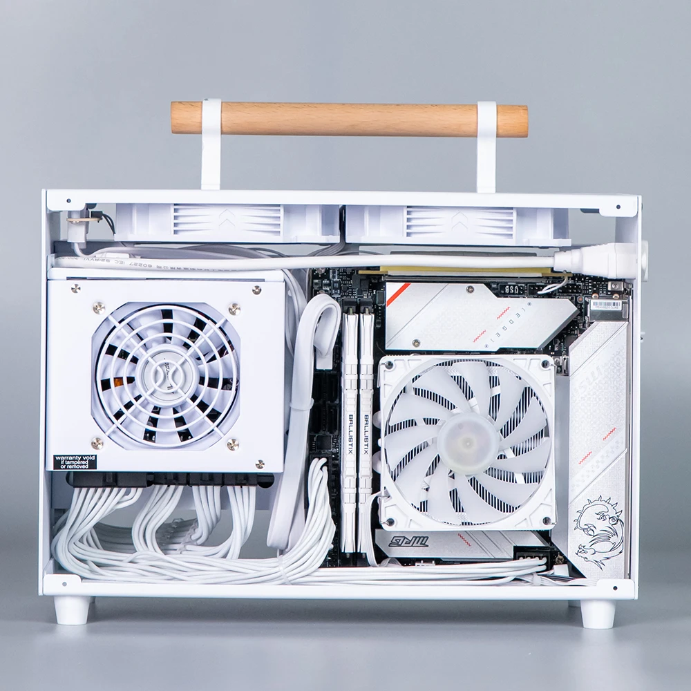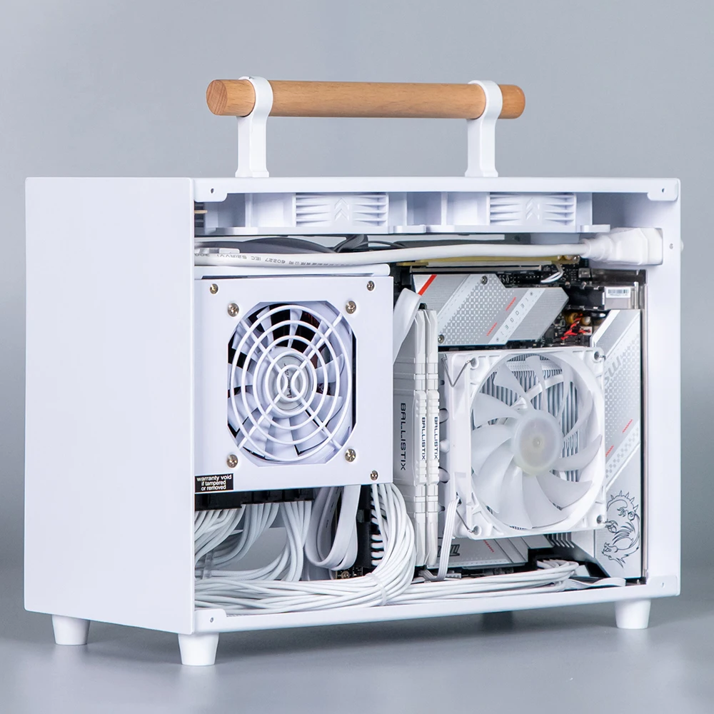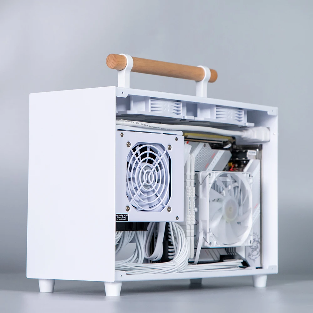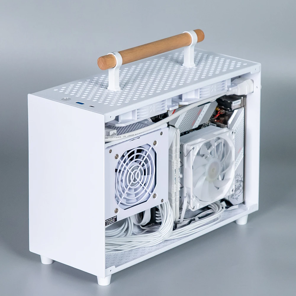 컴퓨터 케이스에는 휴대가 용이하도록 단단한 나무 손잡이가 장착되어 있습니다. 집, 사무실, 출장 등에 적합하고 공간을 차지하지 않는 작은 크기.
