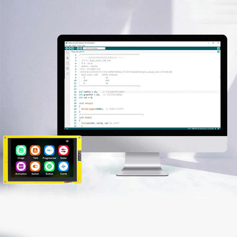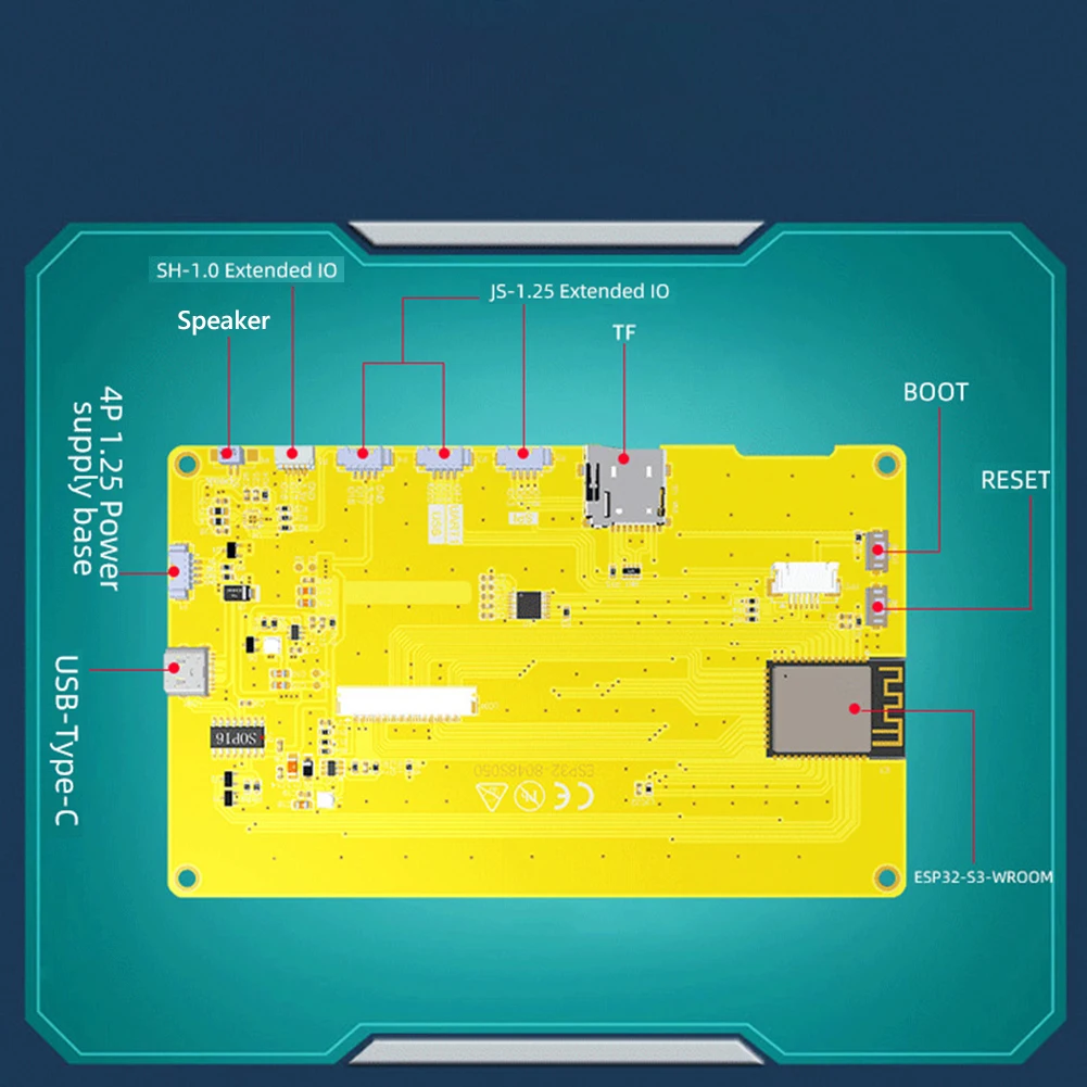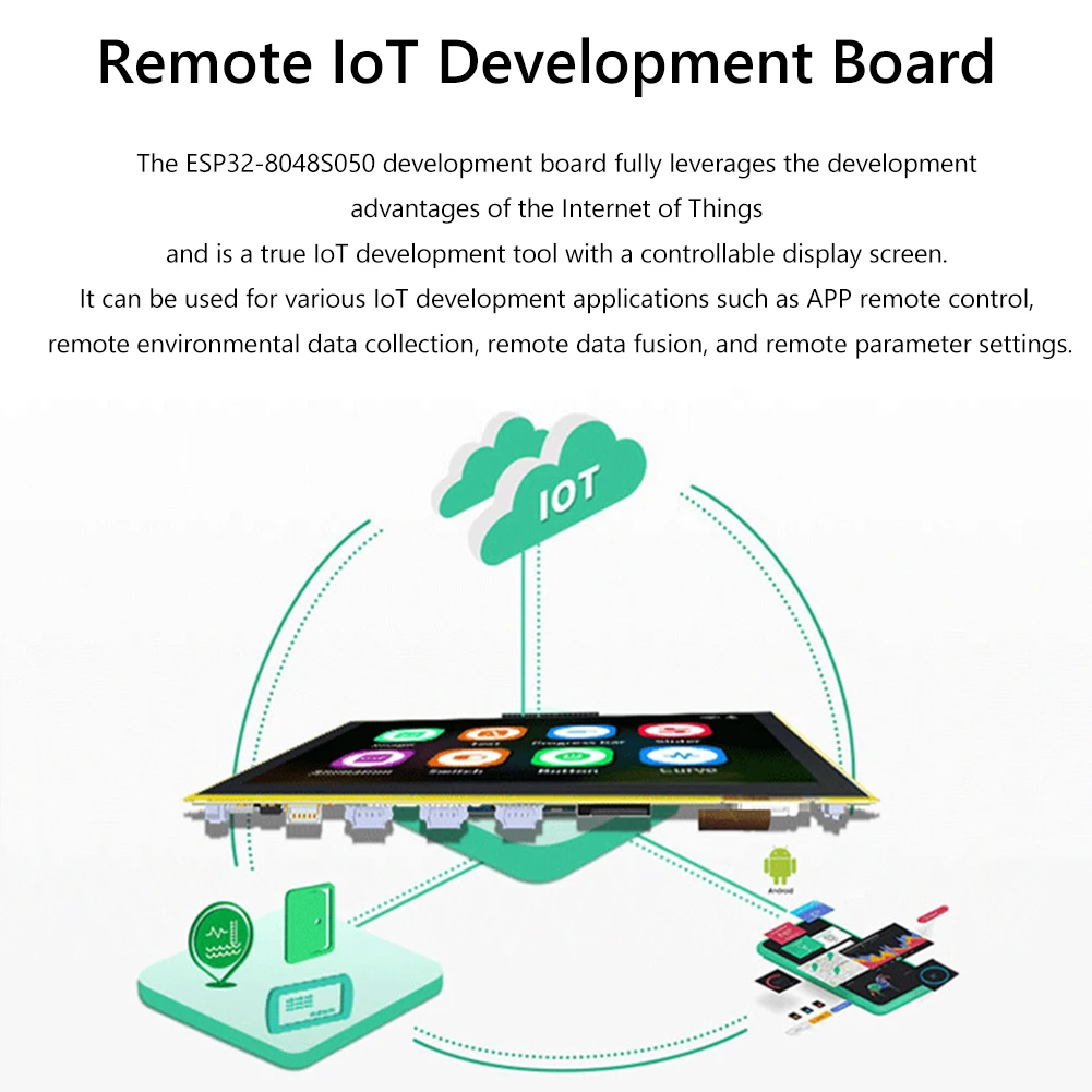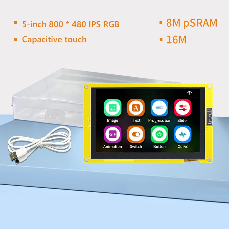 ESP32 ESP32-S3-WROOM-1 개발 보드 스마트 디스플레이 화면 8M PSRAM St7262 16MB 플래시 모듈 5 인치 IPS RGB LCD TFT WIFI 블루투스 호환 특징: 1. 듀얼 코어 CPU 및 통합 WiFi/Bluetooth 호환:ESP32-S3-WROOM-1 모듈에는 최대 240 MHz까지 도달 할 수있는 듀얼 코어 MCU가 장착되어 있으며 WiFi 및 Bluetooth 호환 기능이 포함되어 있습니다. 2. 대용량 메모리 및 고해상도 디스플레이:8M PSRAM 및 16MB 플래시가 장착 된이 개발 보드에는 800X480 해상도의 IPS LCD TFT 지능형 디스플레이 모듈이 장착되어있어 풍부한 색상 디스플레이를 제공합니다. 3. 사용하기 쉽고 확장:이 보드에는 사전로드 된 샘플 프로그램이 제공되며 원클릭 다운로드는 물론 TF 카드 슬롯이있는 확장 가능한 스토리지를 지원합니다. 4. 유연한 개발 환경:Arduino IDE, ESP IDE, MicroPython 및 Mixly를 지원하는이 모듈은 개발자가 선택할 수있는 다양한 옵션을 제공합니다. 5. 포괄적 인 라이브러리 기능:개발자가 프로젝트를 빠르게 시작할 수 있도록 기능 라이브러리 및 예제 프로그램을 사용할 수 있습니다. 사양: 원산지: 중국 본토 옵션: 터치 없음, 정전식 터치 (선택 사항) 크기: 5.0 인치 유형: TFT 드라이버 칩: St7262 해상도: 800*480 (픽셀) 디스플레이 색상: 16 비트 RGB 65K 유효 디스플레이 영역: 108.00*64.80 (mm) 관점: IPS 작업 온도: -20 ℃ ~ 70 ℃ 보관 온도: -30 ℃ ~ 80 ℃ 작동 전압: 5V 전력 소비: 약 320mA 모듈 크기: 약 137x8 4mm/5.39x3.31inch 무게: 약 150g 참고: