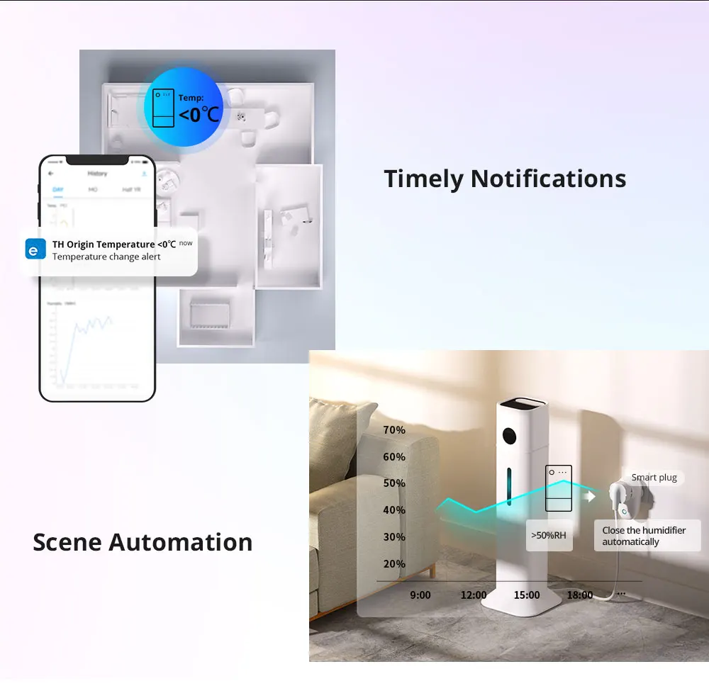 TH는 온도와 습도를 실시간으로 모니터링합니다. 사전 설정된 임계 값에 도달하거나 기기의 켜기/끄기 상태가 변경되면 휴대 전화에서 푸시 알림을 받게됩니다.