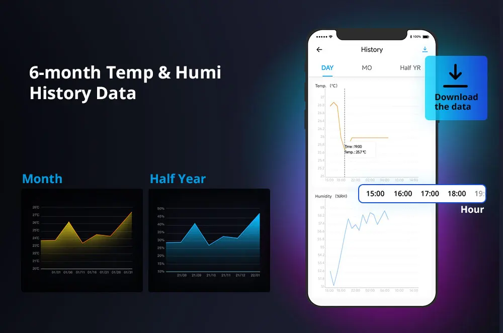 시간, 일 및 월별로 임시 및 humi 이력 데이터를 검토하도록 지원합니다. 지난 6 개월 내역 데이터를 에서 내보낼 수 있습니다. Xlsx 형식이며 시간에 정확합니다.