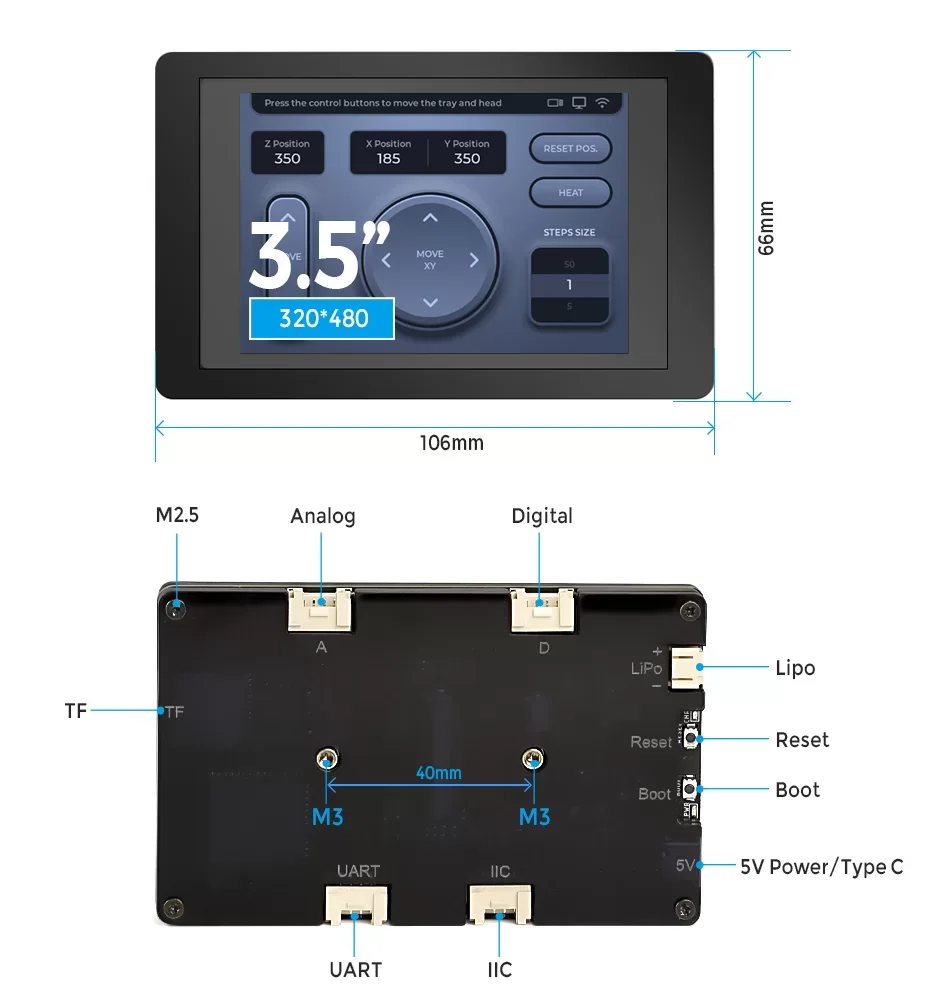 이 터미널에는 3.5 인치 병렬 RGB 인터페이스가 있습니다.320*48060 의 프레임 속도 (FPS) 에서 완벽한 이미지 출력을 보장합니다. 이 터미널 뒷면에 소개했습니다.4 크로테일 인터페이스Crowtail 시리즈 센서, 플러그 앤 플레이와 함께 사용할 수 있으며 더 흥미로운 프로젝트를 빠르고 편리하게 만들 수 있습니다. 또한 확장 스토리지 (SPI 리드) 를위한 SD 카드 슬롯과 부저 기능도 갖추고 있습니다. 지원ESP-IDF 및 아두이노 IDE개발 및 호환파이썬/마이크로 파이썬/아두이노. 또한 지원합니다.LVGL,모든 MCU, MPU 및 디스플레이 유형에 맞는 아름다운 UI를 만들 수있는 가장 인기있는 무료 오픈 소스 임베디드 그래픽 라이브러리입니다. 온보드 충전 회로 및 리튬 배터리 인터페이스는유형 C 전원 공급 장치인터페이스를 통해 전원을 공급하고 배터리를 동시에 충전하여 야외 장면 확장 가능성을 높일 수 있습니다.
