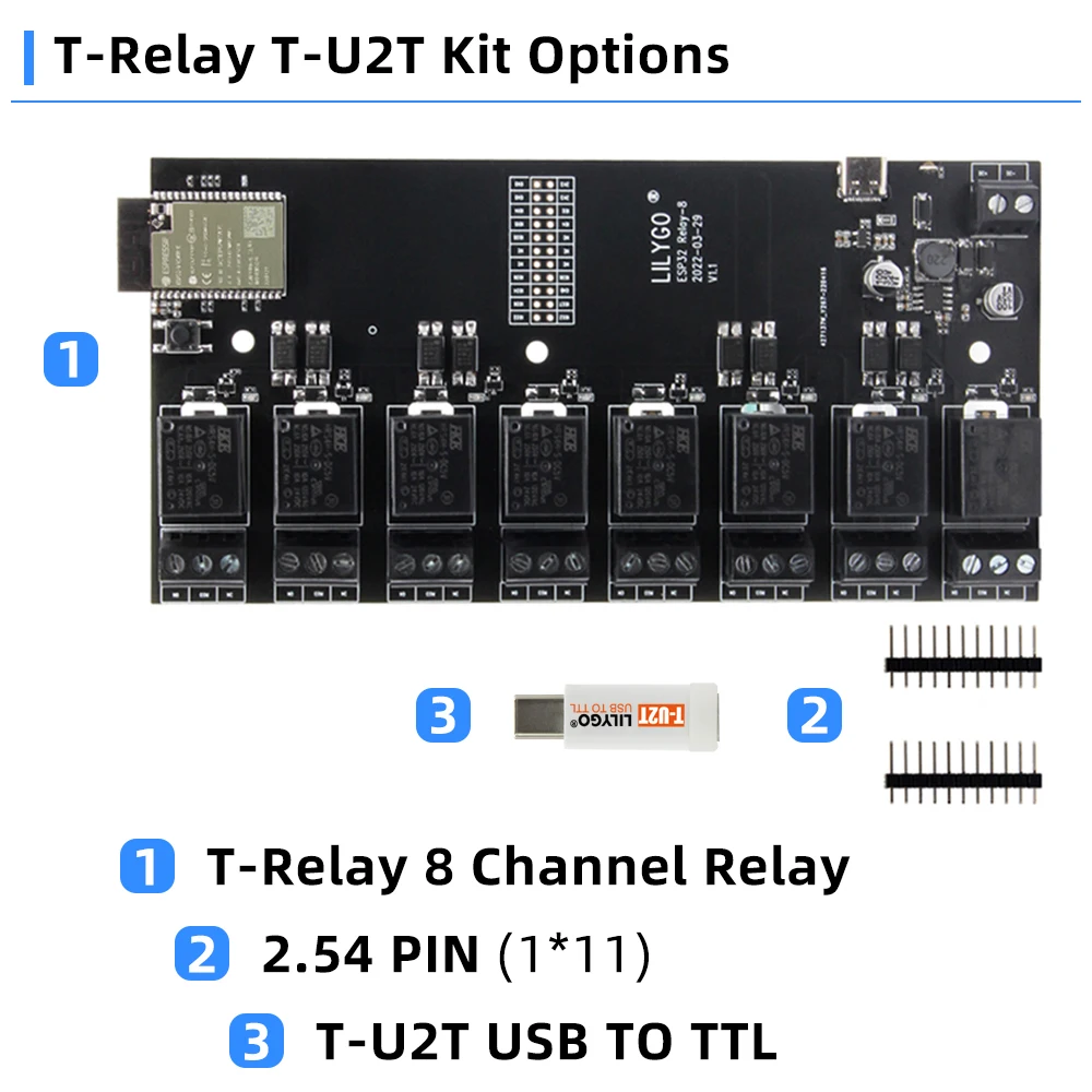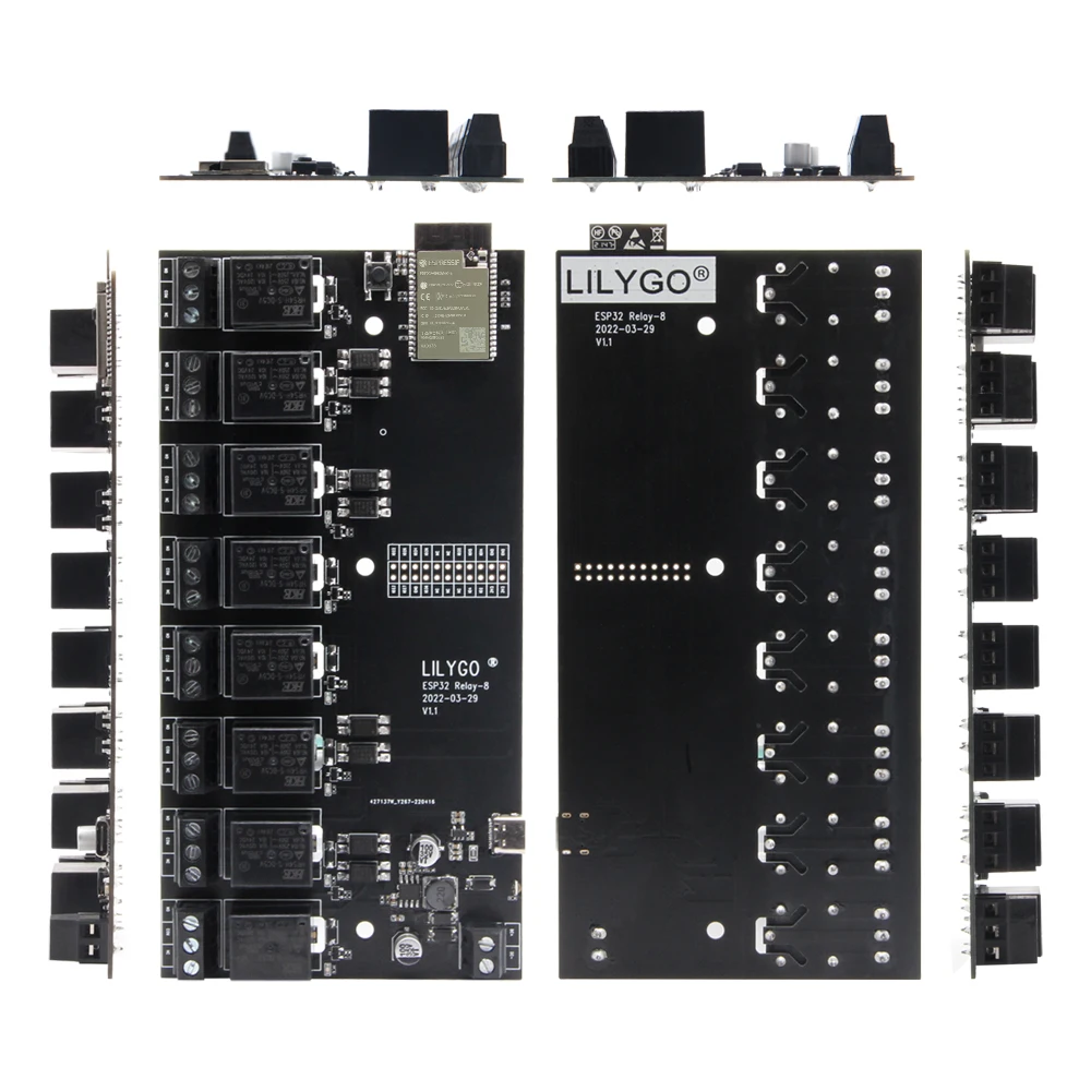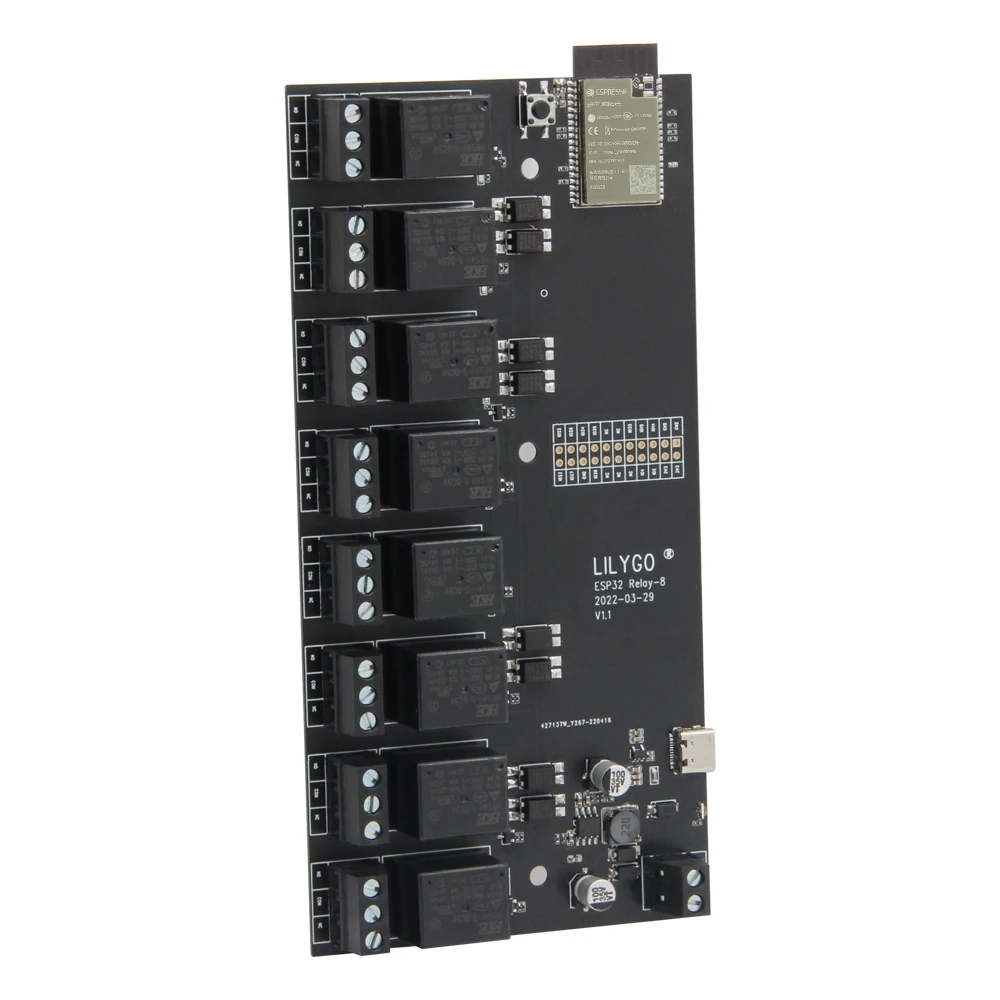 • LILYGO® T-Relay is equipped with 8 Channel Relay (With Optocoupler Support) and ESP32 (Supports WIFI Bluetooth), and each relay is equipped with an individual indicator and a red custom indicator.