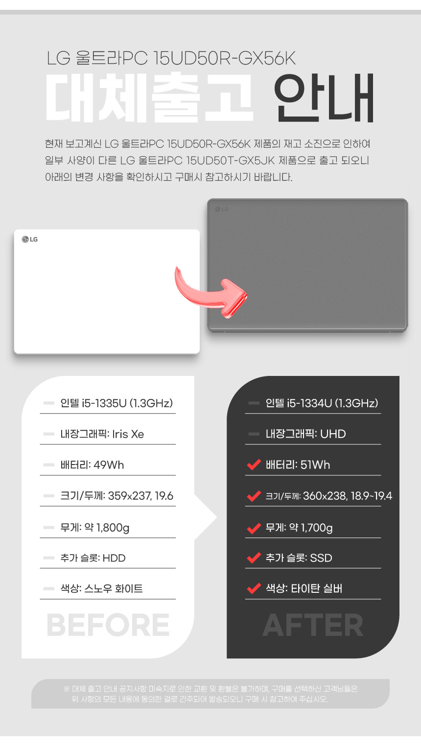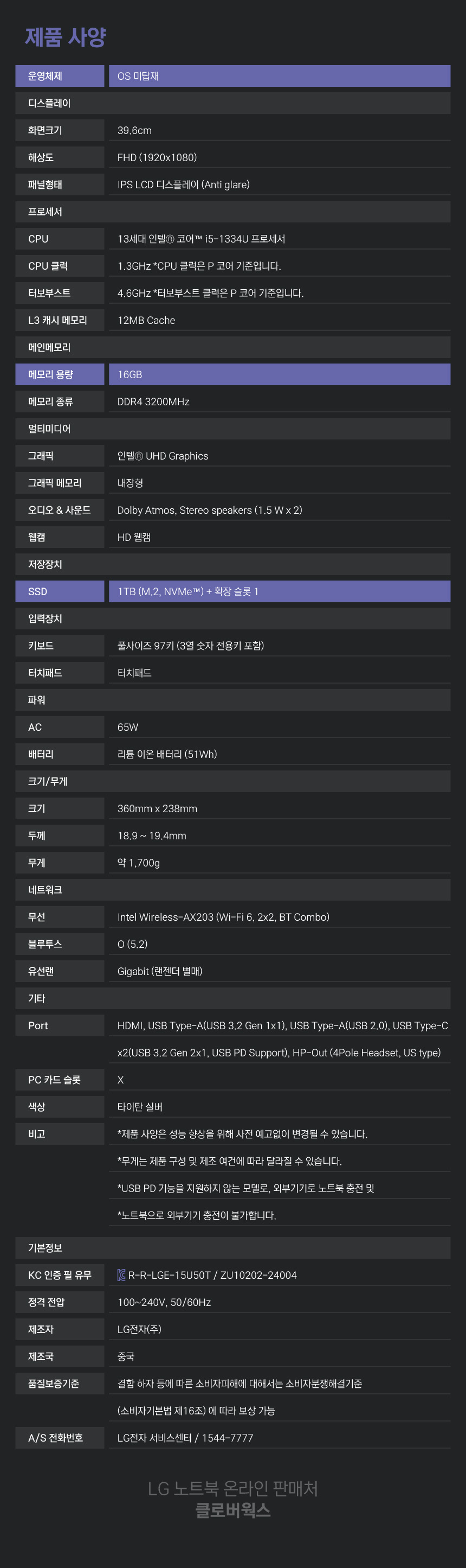 LG 2023 울트라PC 15UD50R-GX56K i5-1335U 16GB 1TB / 사무용 인강용 업무용 대학생 가성비 노트북