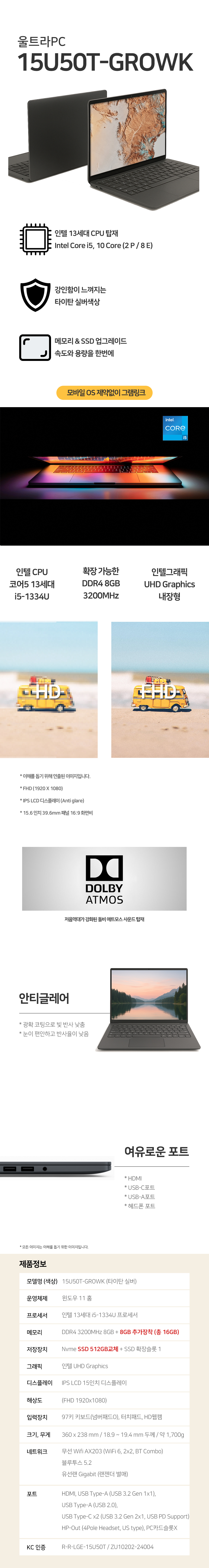 LG전자 울트라PC 15U50T-GROWK SSD 512GB 교체장착 램 8GB + 8GB 추가장착 (총 16GB) CTO 무료배송