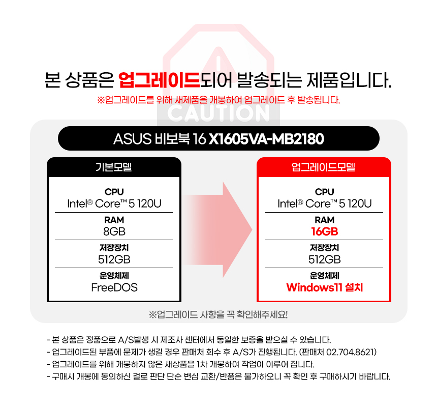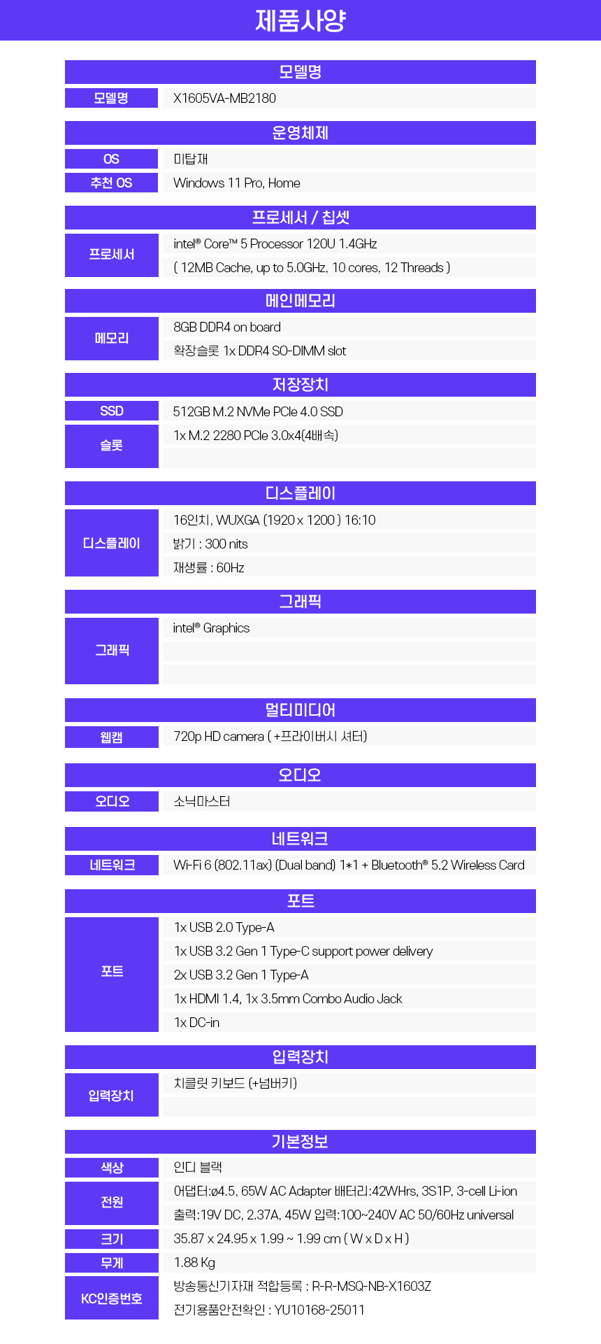 ASUS 비보북 16 X1605VA-MB2180 intel core 5 120U / 16GB / 512GB / Win11 mi